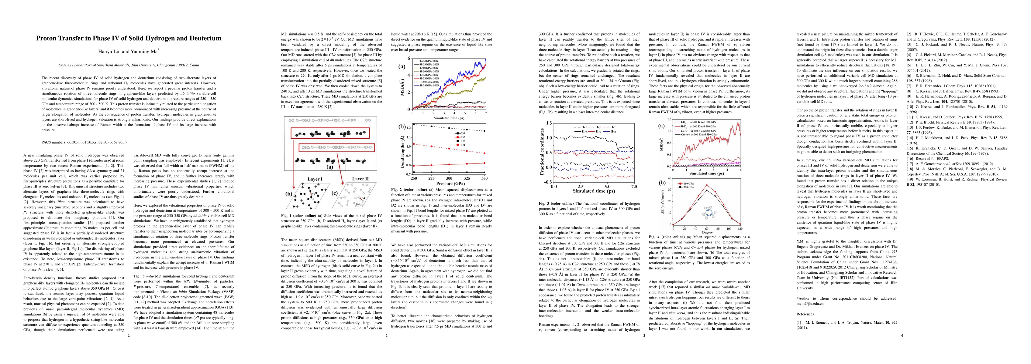 The recent discovery of phase IV of solid hydrogen and deuterium consisting of two alternate layers of graphenelike three-molecule rings and unbound H2 molecules have generated great interests. However, vibrational nature of phase IV remains poorly understood. Here, we report a peculiar proton transfer and a simultaneous rotation of three molecule rings in graphenelike layers predicted by ab initio variable cell molecular dynamics simulations for phase IV of solid hydrogen and deuterium at pressure ranges of from 250 to 350 GPa and temperature range of from 300 to 500 K. This proton transfer is intimately related to the particular elongation of molecules in graphenelike layers, and it becomes more pronounced with increasing pressure at the course of larger elongation of molecules. As the consequence of proton transfer, hydrogen molecules in graphenelike layers are short lived and hydrogen vibration is strongly anharmonic. Our findings provide direct explanations on the observed abrupt increase of Raman width at the formation of phase IV and its large increase with pressure.