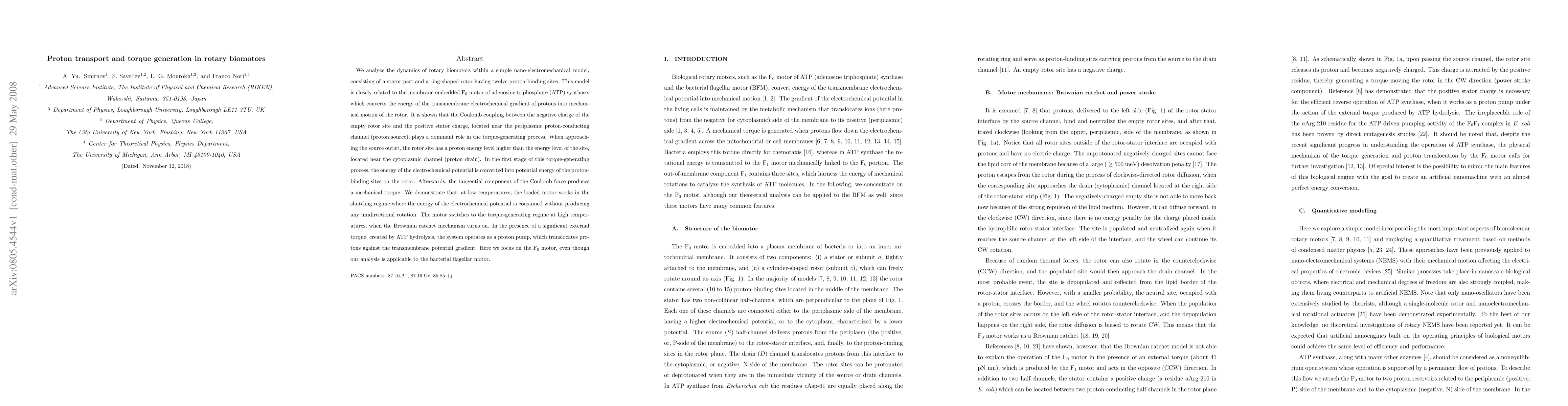 We analyze the dynamics of rotary biomotors within a simple nano-electromechanical model, consisting of a stator part and a ring-shaped rotor having twelve proton-binding sites. This model is closely related to the membrane-embedded F$_0$ motor of adenosine triphosphate (ATP) synthase, which converts the energy of the transmembrane electrochemical gradient of protons into mechanical motion of the rotor. It is shown that the Coulomb coupling between the negative charge of the empty rotor site and the positive stator charge, located near the periplasmic proton-conducting channel (proton source), plays a dominant role in the torque-generating process. When approaching the source outlet, the rotor site has a proton energy level higher than the energy level of the site, located near the cytoplasmic channel (proton drain). In the first stage of this torque-generating process, the energy of the electrochemical potential is converted into potential energy of the proton-binding sites on the rotor. Afterwards, the tangential component of the Coulomb force produces a mechanical torque. We demonstrate that, at low temperatures, the loaded motor works in the shuttling regime where the energy of the electrochemical potential is consumed without producing any unidirectional rotation. The motor switches to the torque-generating regime at high temperatures, when the Brownian ratchet mechanism turns on. In the presence of a significant external torque, created by ATP hydrolysis, the system operates as a proton pump, which translocates protons against the transmembrane potential gradient. Here we focus on the F$_0$ motor, even though our analysis is applicable to the bacterial flagellar motor.