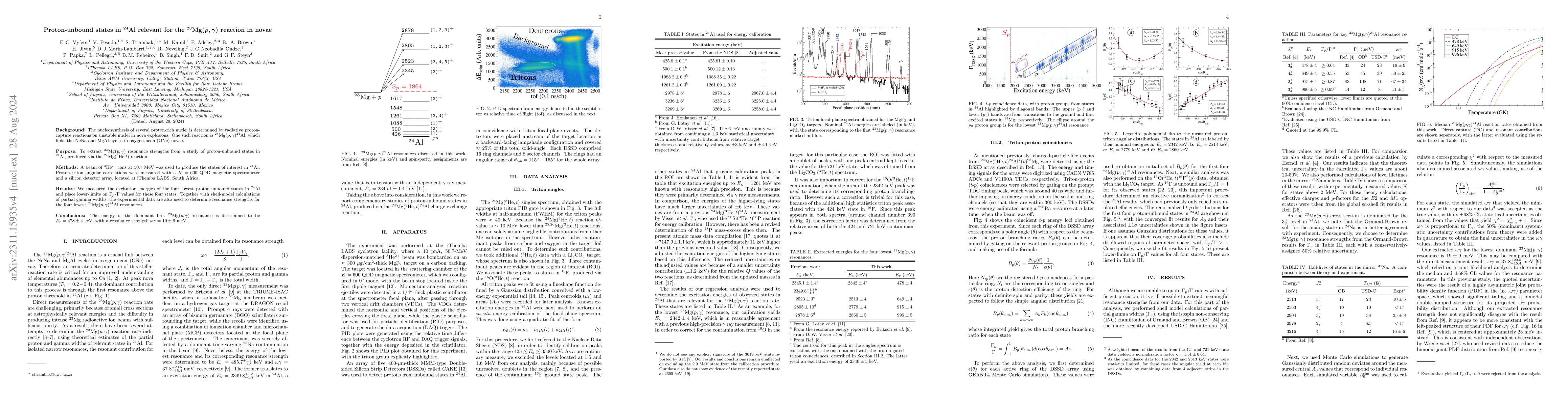 This study investigates proton-unbound states in $^{24}{\rm Al}$ to determine resonance strengths for the $^{23}{\rm Mg}(p,\gamma)$ reaction, crucial for nucleosynthesis in novae. The experiment, using a $^3 {\rm He}^{2+}$ beam, identified the lowest four proton-unbound states and derived resonance strengths for the first three $^{23}{\rm Mg}(p,\gamma)^{24}{\rm Al}$ resonances, with the dominant resonance found at $E_{r} = 478 \pm 4$ keV and $\omega \gamma = 19 \pm 9$ meV.