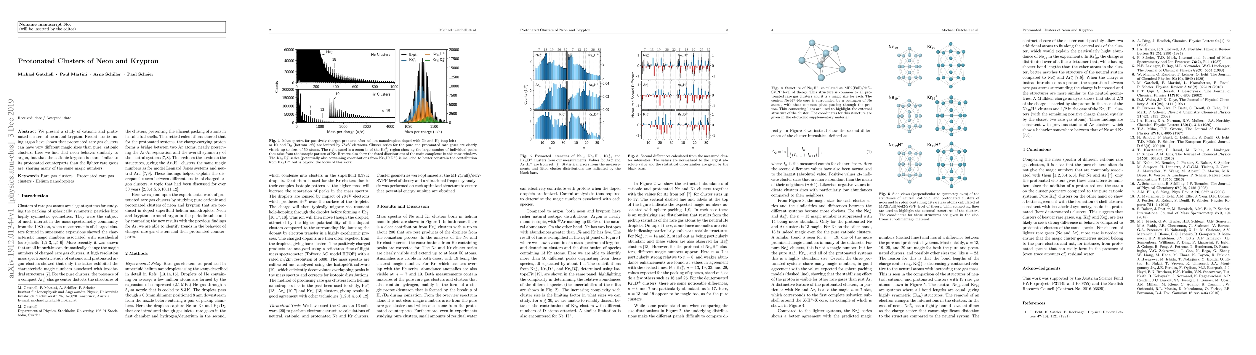 Researchers studied clusters of neon and krypton, finding that they behave similarly to argon, with magic sizes varying between protonated and pure clusters. Cationic krypton shows more similarity to its protonated counterparts than lighter rare gases.