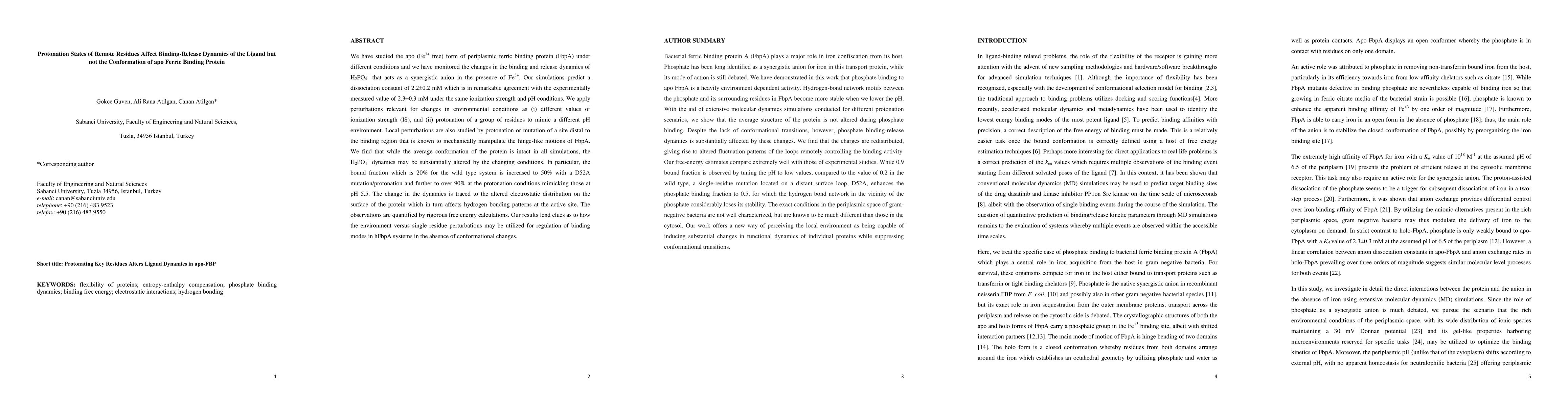 We have studied the apo (Fe3+ free) form of periplasmic ferric binding protein (FbpA) under different conditions and we have monitored the changes in the binding and release dynamics of H2PO4- that acts as a synergistic anion in the presence of Fe3+. Our simulations predict a dissociation constant of 2.2$\pm$0.2 mM which is in remarkable agreement with the experimentally measured value of 2.3$\pm$0.3 mM under the same ionization strength and pH conditions. We apply perturbations relevant for changes in environmental conditions as (i) different values of ionic strength (IS), and (ii) protonation of a group of residues to mimic a different pH environment. Local perturbations are also studied by protonation or mutation of a site distal to the binding region that is known to mechanically manipulate the hinge-like motions of FbpA. We find that while the average conformation of the protein is intact in all simulations, the H2PO4- dynamics may be substantially altered by the changing conditions. In particular, the bound fraction which is 20$\%$ for the wild type system is increased to 50$\%$ with a D52A mutation/protonation and further to over 90$\%$ at the protonation conditions mimicking those at pH 5.5. The change in the dynamics is traced to the altered electrostatic distribution on the surface of the protein which in turn affects hydrogen bonding patterns at the active site. The observations are quantified by rigorous free energy calculations. Our results lend clues as to how the environment versus single residue perturbations may be utilized for regulation of binding modes in hFbpA systems in the absence of conformational changes.