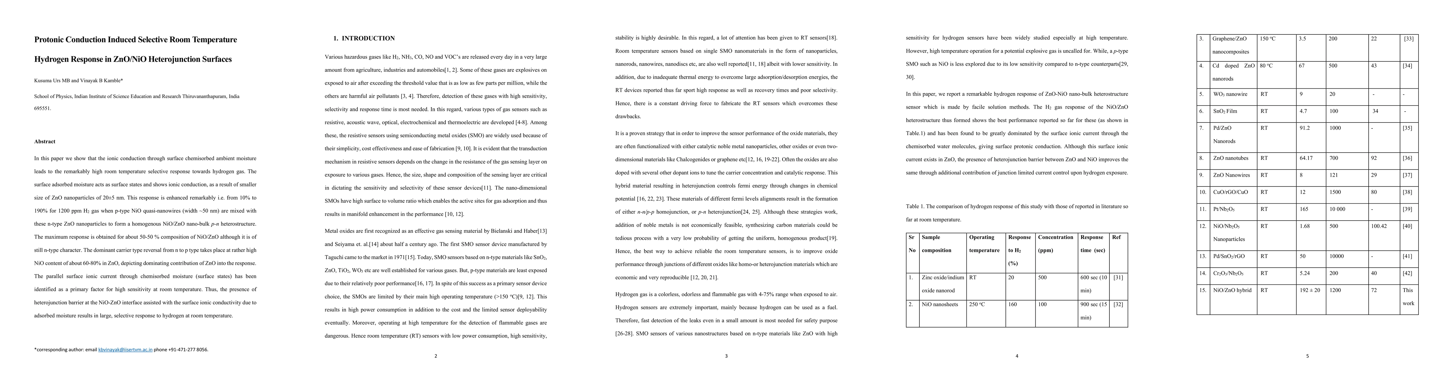 This paper demonstrates that ZnO/NiO heterojunction surfaces exhibit high room temperature selective hydrogen response due to ionic conduction through surface chemisorbed moisture, significantly enhanced by forming a NiO/ZnO nano-bulk p-n heterostructure, achieving a maximum response at a 50-50% composition.