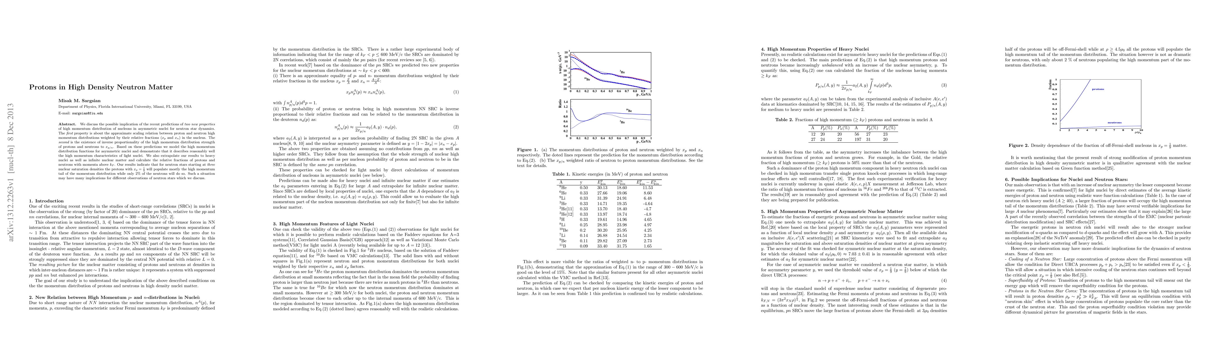 We discuss the possible implication of the recent predictions of two new properties of high momentum distribution of nucleons in asymmetric nuclei for neutron star dynamics. The first property is about the approximate scaling relation between proton and neutron high momentum distributions weighted by their relative fractions ($x_p$ and $x_n$) in the nucleus. The second is the existence of inverse proportionality of the high momentum distribution strength of protons and neutrons to $x_{p/n}$. Based on these predictions we model the high momentum distribution functions for asymmetric nuclei and demonstrate that it describes reasonably well the high momentum characteristics of light nuclei. We also extrapolate our results to heavy nuclei as well as infinite nuclear matter and calculate the relative fractions of protons and neutrons with momenta above $k_{F}$. Our results indicate that for neutron stars starting at {\em three} nuclear saturation densities the protons with $x_p = {1\over 9}$ will populate mostly the high momentum tail of the momentum distribution while only $2\%$ of the neutrons will do so. Such a situation may have many implications for different observations of neutron stars which we discuss.