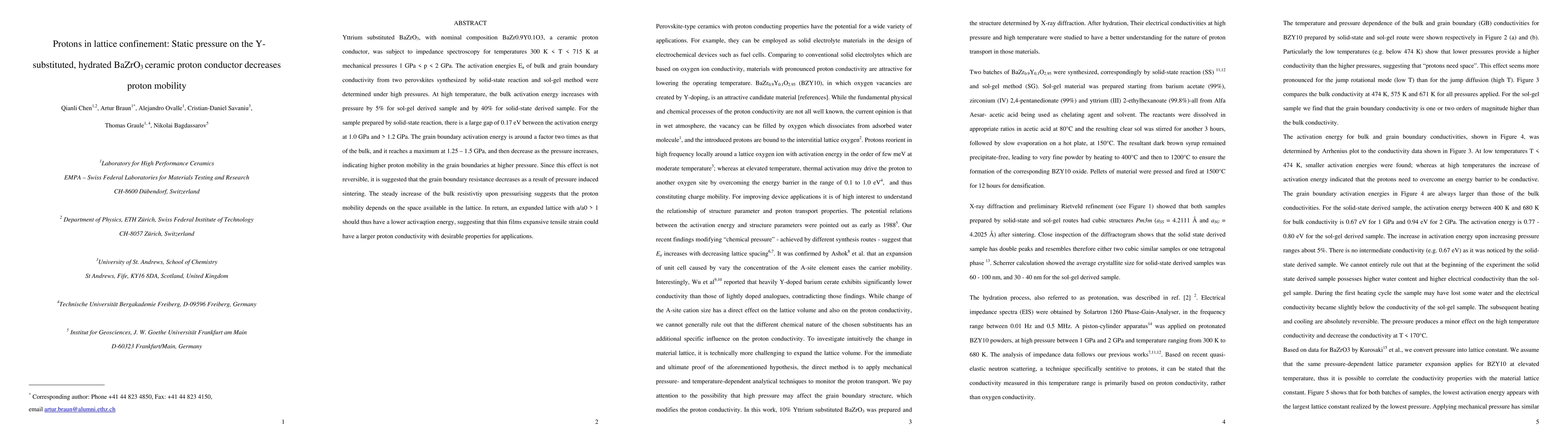 This study investigates the effect of static pressure on proton mobility in Y-substituted BaZrO3 ceramic proton conductors. High pressure decreases proton mobility, with significant differences between bulk and grain boundary activation energies, suggesting that lattice expansion could enhance proton conductivity.