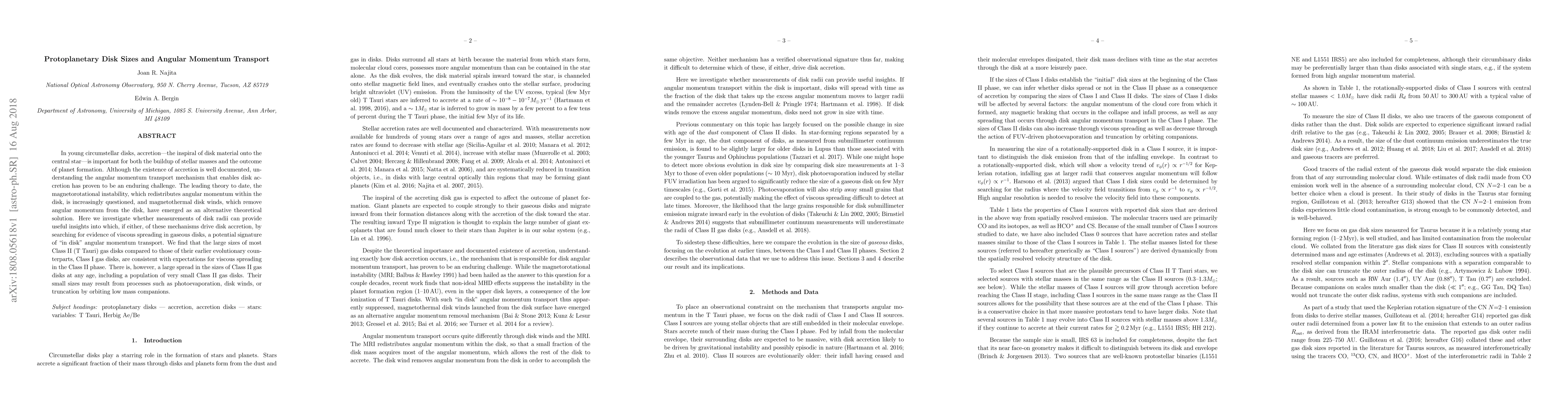 This paper investigates angular momentum transport mechanisms in young circumstellar disks, finding that the large sizes of Class II gas disks suggest viscous spreading, consistent with current theories. However, the presence of small Class II disks indicates alternative processes like photoevaporation or disk winds may also play a role.