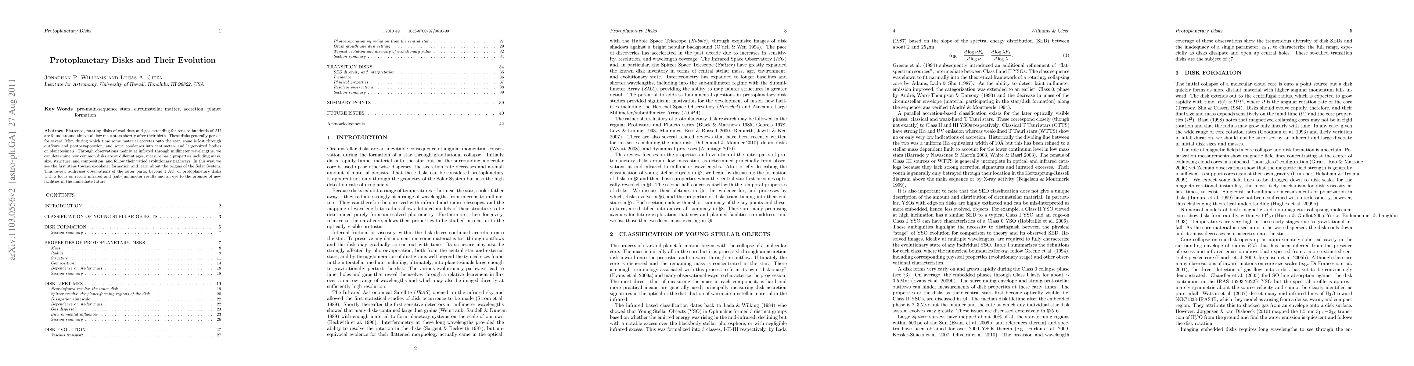 This paper reviews observations of protoplanetary disks, focusing on their outer regions beyond 1 AU, using recent infrared and millimeter data. It explores the disks' evolution, accretion, outflows, and formation of planetesimals, providing insights into exoplanet formation and the origins of the Solar System.
