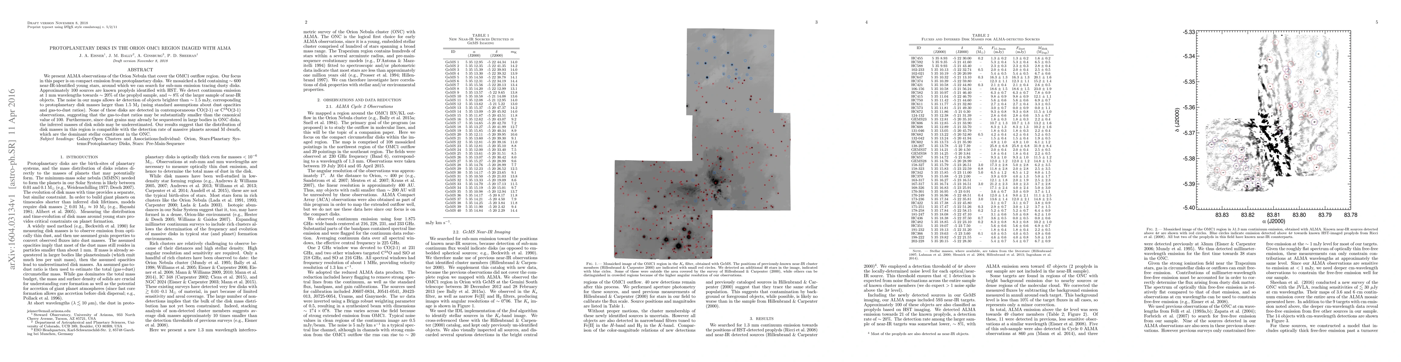 We present ALMA observations of the Orion Nebula that cover the OMC1 outflow region. Our focus in this paper is on compact emission from protoplanetary disks. We mosaicked a field containing $\sim 600$ near-IR-identified young stars, around which we can search for sub-mm emission tracing dusty disks. Approximately 100 sources are known proplyds identified with HST. We detect continuum emission at 1 mm wavelengths towards $\sim 20\%$ of the proplyd sample, and $\sim 8\%$ of the larger sample of near-IR objects. The noise in our maps allows 4$\sigma$ detection of objects brighter than $\sim 1.5$ mJy, corresponding to protoplanetary disk masses larger than 1.5 M$_{\rm J}$ (using standard assumptions about dust opacities and gas-to-dust ratios). None of these disks are detected in contemporaneous CO(2-1) or C$^{18}$O(2-1) observations, suggesting that the gas-to-dust ratios may be substantially smaller than the canonical value of 100. Furthermore, since dust grains may already be sequestered in large bodies in ONC disks, the inferred masses of disk solids may be underestimated. Our results suggest that the distribution of disk masses in this region is compatible with the detection rate of massive planets around M dwarfs, which are the dominant stellar constituent in the ONC.