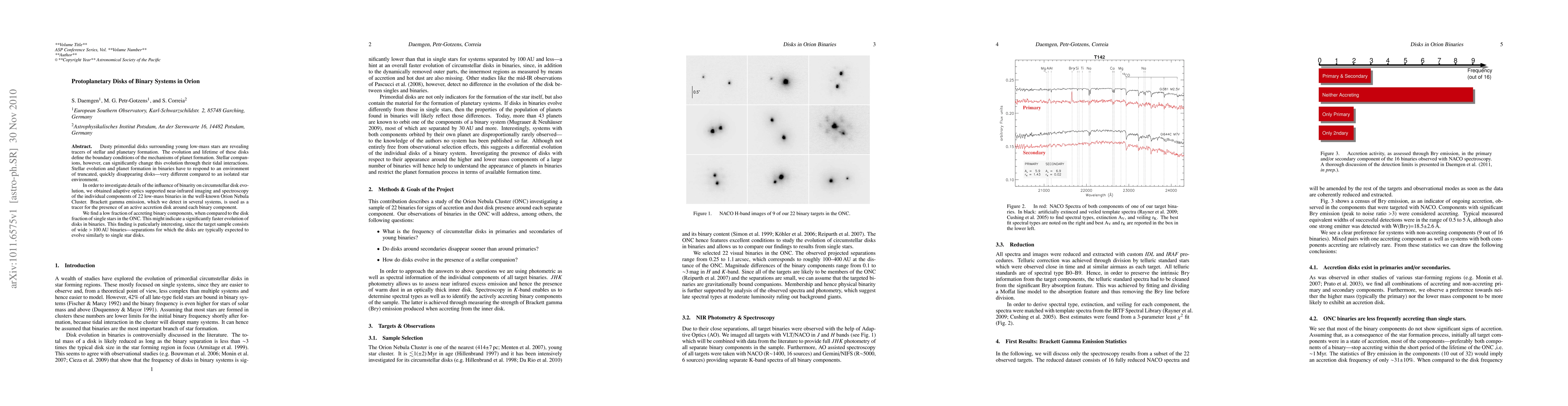 Dusty primordial disks surrounding young low-mass stars are revealing tracers of stellar and planetary formation. The evolution and lifetime of these disks define the boundary conditions of the mechanisms of planet formation. Stellar companions, however, can significantly change this evolution through their tidal interactions. Stellar evolution and planet formation in binaries have to respond to an environment of truncated, quickly disappearing disks--very different compared to an isolated star environment. In order to investigate details of the influence of binarity on circumstellar disk evolution, we obtained adaptive optics supported near-infrared imaging and spectroscopy of the individual components of 22 low-mass binaries in the well-known Orion Nebula Cluster. Brackett gamma emission, which we detect in several systems, is used as a tracer for the presence of an active accretion disk around each binary component. We find a low fraction of accreting binary components, when compared to the disk fraction of single stars in the ONC. This might indicate a significantly faster evolution of disks in binaries. This finding is paticularly interesting, since the target sample consists of wide >100AU binaries--separations for which the disks are typically expected to evolve similarly to single star disks.