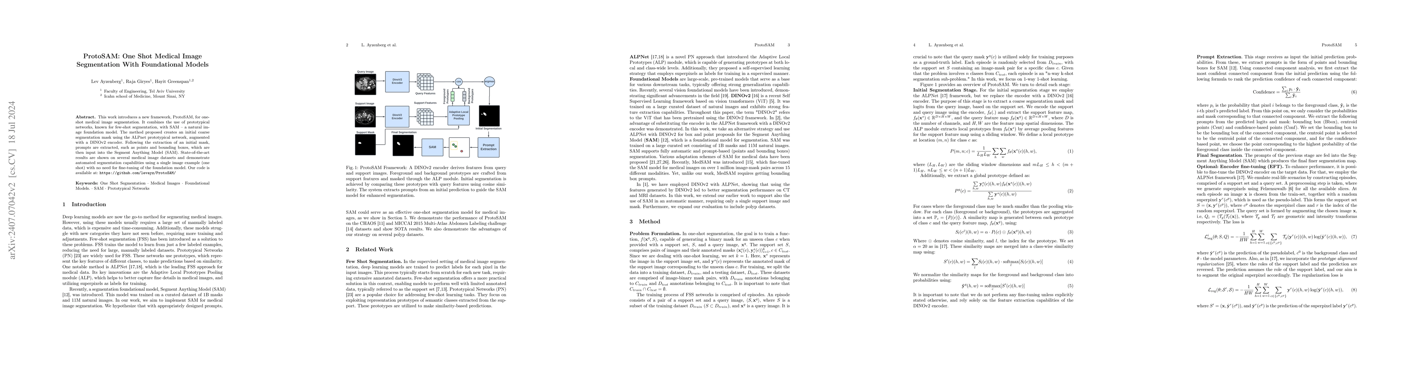 ProtoSAM integrates prototypical networks with the Segment Anything Model (SAM) to achieve one-shot medical image segmentation, leveraging an initial coarse mask from ALPnet and DINOv2 encoder, followed by SAM refinement with extracted prompts, achieving state-of-the-art results without model fine-tuning.
