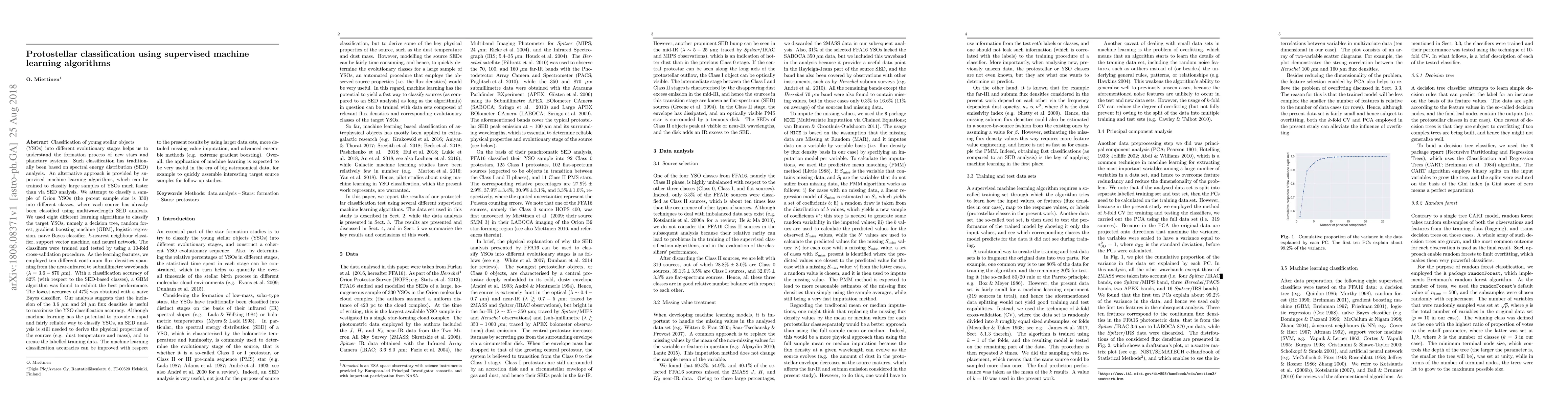 This paper explores the use of supervised machine learning algorithms to classify young stellar objects (YSOs) in Orion into different evolutionary stages, achieving 82% accuracy with gradient boosting. While machine learning offers a rapid classification method, it still requires spectral energy distribution analysis for detailed physical properties.