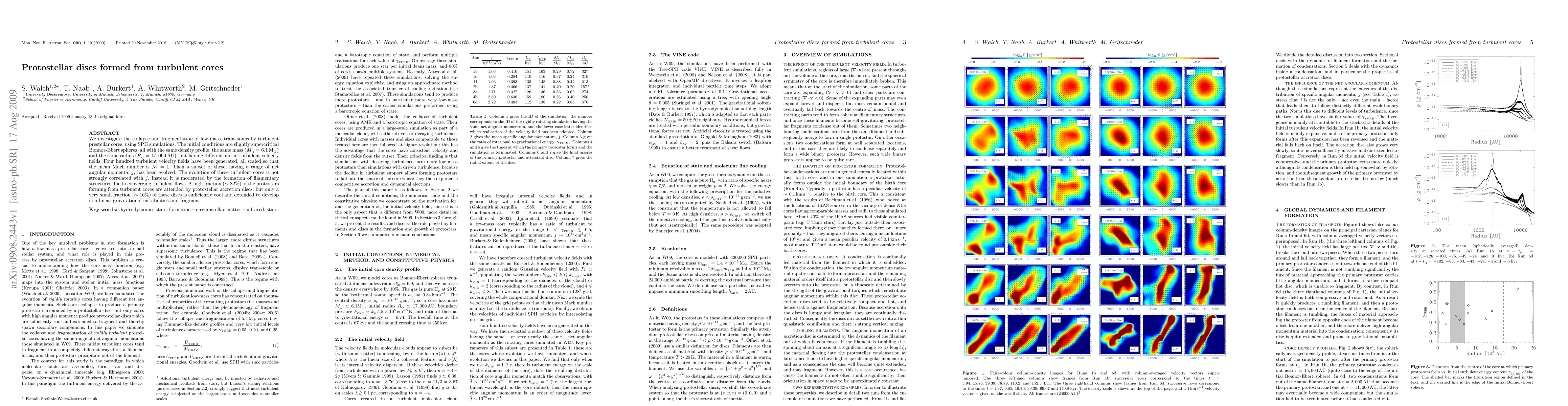 We investigate the collapse and fragmentation of low-mass, trans-sonically turbulent prestellar cores, using SPH simulations. The initial conditions are slightly supercritical Bonnor-Ebert spheres, all with the same density profile, the same mass (M_O=6.1 Msun) and the same radius (R_O=17,000 AU), but having different initial turbulent velocity fields. Four hundred turbulent velocity fields have been generated, all scaled so that the mean Mach number is M=1. Then a subset of these, having a range of net angular momenta, j, has been evolved. The evolution of these turbulent cores is not strongly correlated with j. Instead it is moderated by the formation of filamentary structures due to converging turbulent flows. A high fraction (~ 82%) of the protostars forming from turbulent cores are attended by protostellar accretion discs, but only a very small fraction (~16%) of these discs is sufficiently cool and extended to develop non-linear gravitational instabilities and fragment.