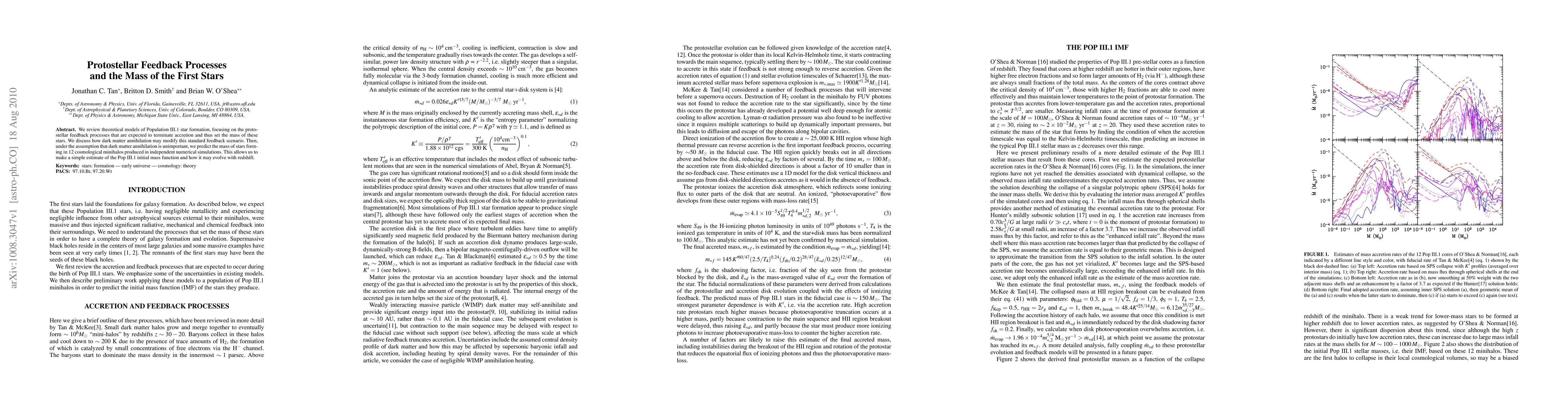 We review theoretical models of Population III.1 star formation, focusing on the protostellar feedback processes that are expected to terminate accretion and thus set the mass of these stars. We discuss how dark matter annihilation may modify this standard feedback scenario. Then, under the assumption that dark matter annihilation is unimportant, we predict the mass of stars forming in 12 cosmological minihalos produced in independent numerical simulations. This allows us to make a simple estimate of the Pop III.1 initial mass function and how it may evolve with redshift.