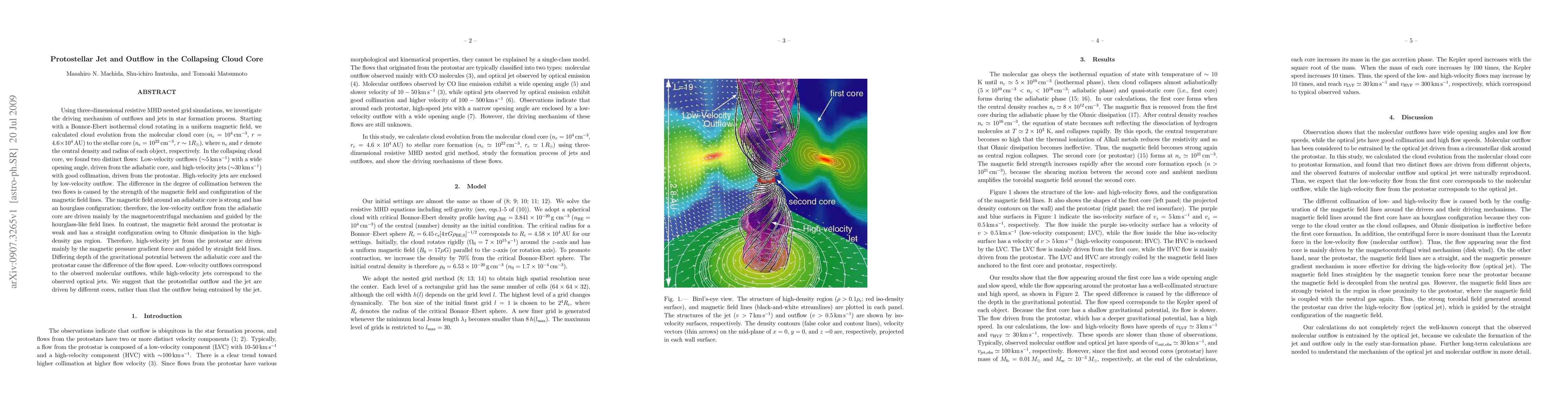 This study uses resistive MHD simulations to explore the driving mechanisms of protostellar jets and outflows, identifying two distinct flows: low-velocity outflows from the adiabatic core and high-velocity jets from the protostar, driven by different magnetic field configurations and gravitational potential depths.