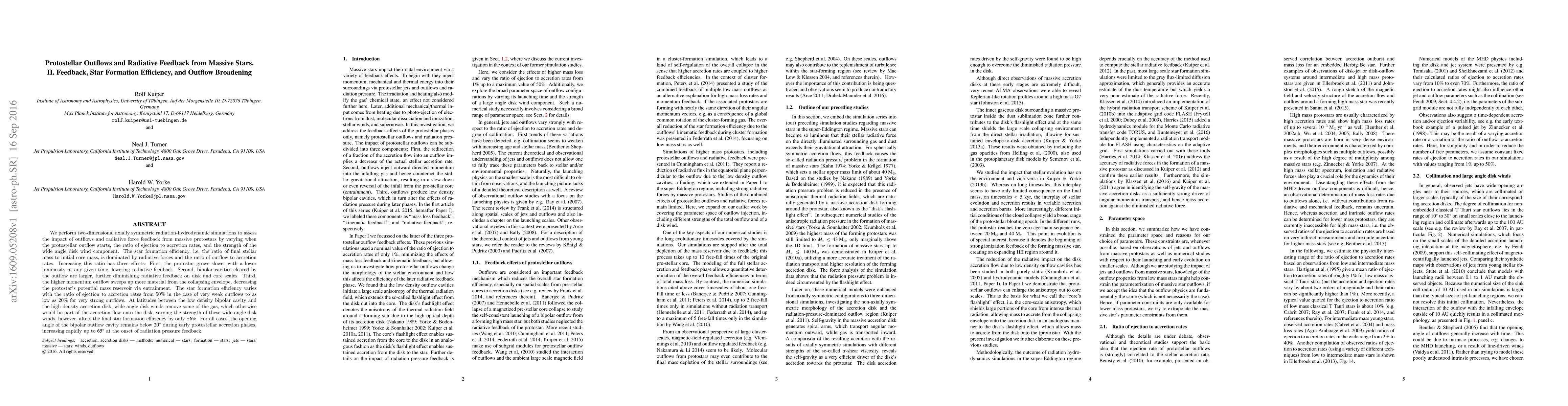 We perform two-dimensional axially symmetric radiation-hydrodynamic simulations to assess the impact of outflows and radiative force feedback from massive protostars by varying when the protostellar outflow starts, the ratio of ejection to accretion rates, and the strength of the wide angle disk wind component. The star formation efficiency, i.e. the ratio of final stellar mass to initial core mass, is dominated by radiative forces and the ratio of outflow to accretion rates. Increasing this ratio has three effects: First, the protostar grows slower with a lower luminosity at any given time, lowering radiative feedback. Second, bipolar cavities cleared by the outflow are larger, further diminishing radiative feedback on disk and core scales. Third, the higher momentum outflow sweeps up more material from the collapsing envelope, decreasing the protostar's potential mass reservoir via entrainment. The star formation efficiency varies with the ratio of ejection to accretion rates from 50% in the case of very weak outflows to as low as 20% for very strong outflows. At latitudes between the low density bipolar cavity and the high density accretion disk, wide angle disk winds remove some of the gas, which otherwise would be part of the accretion flow onto the disk; varying the strength of these wide angle disk winds, however, alters the final star formation efficiency by only +/-6%. For all cases, the opening angle of the bipolar outflow cavity remains below 20 degree during early protostellar accretion phases, increasing rapidly up to 65 degree at the onset of radiation pressure feedback.