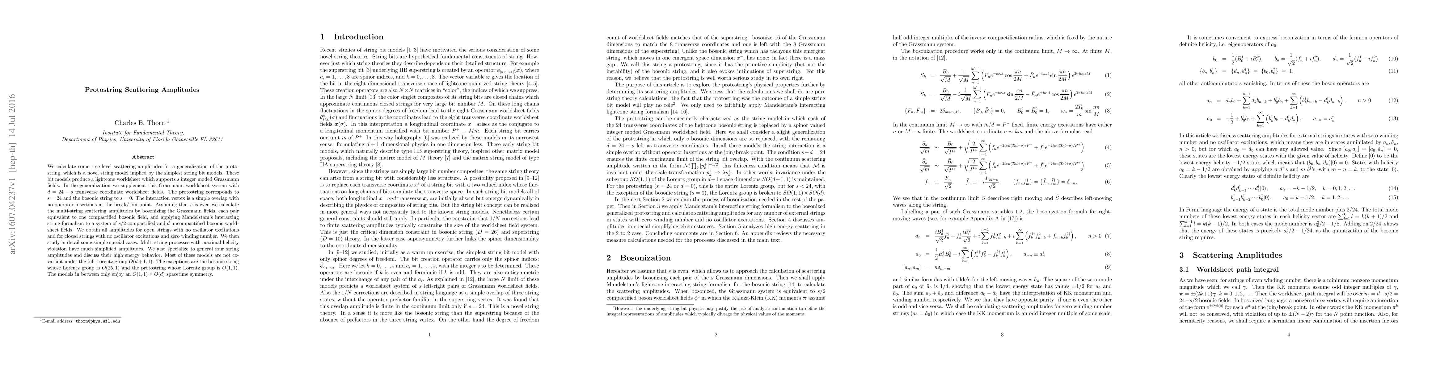 We calculate some tree level scattering amplitudes for a generalization of the protostring, which is a novel string model implied by the simplest string bit models. These bit models produce a lightcone worldsheet which supports $s$ integer moded Grassmann fields. In the generalization we supplement this Grassmann worldsheet system with $d=24-s$ transverse coordinate worldsheet fields. The protostring corresponds to $s=24$ and the bosonic string to $s=0$. The interaction vertex is a simple overlap with no operator insertions at the break/join point. Assuming that $s$ is even we calculate the multi-string scattering amplitudes by bosonizing the Grassmann fields, each pair equivalent to one compactified bosonic field, and applying Mandelstam's interacting string formalism to a system of $s/2$ compactified and $d$ uncompactified bosonic worldsheet fields. We obtain all amplitudes for open strings with no oscillator excitations and for closed strings with no oscillator excitations and zero winding number. We then study in detail some simple special cases. Multi-string processes with maximal helicity violation have much simplified amplitudes. We also specialize to general four string amplitudes and discuss their high energy behavior. Most of these models are not covariant under the full Lorentz group $O(d+1,1)$. The exceptions are the bosonic string whose Lorentz group is $O(25,1)$ and the protostring whose Lorentz group is $O(1,1)$. The models in between only enjoy an $O(1,1)\times O(d)$ spacetime symmetry.