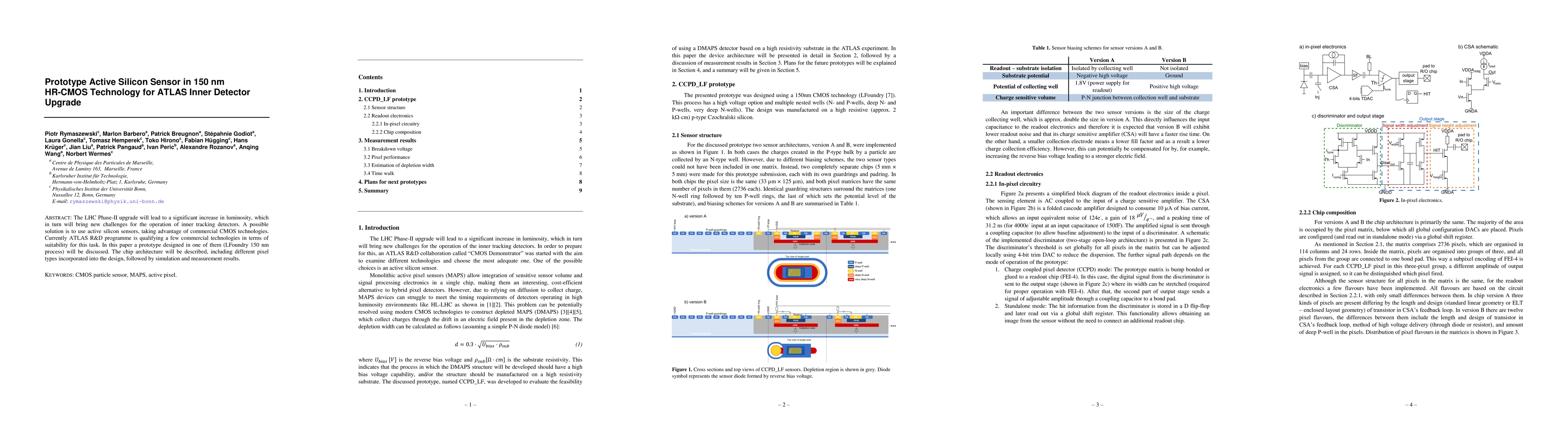 This paper presents a prototype active silicon sensor designed in a 150 nm HR-CMOS technology by LFoundry, intended for ATLAS Inner Detector upgrade at LHC Phase-II. It details the chip architecture with various pixel types, supported by simulation and measurement results.
