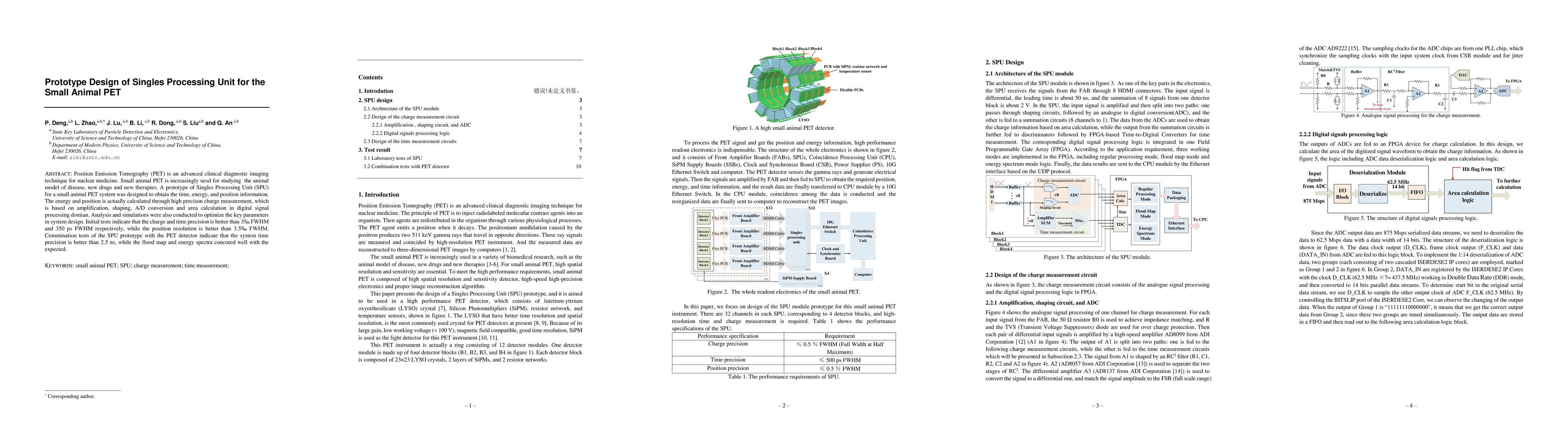 A prototype Singles Processing Unit for small animal PET was designed to improve time, energy, and position information accuracy, with initial results showing high precision in charge measurement and system performance.