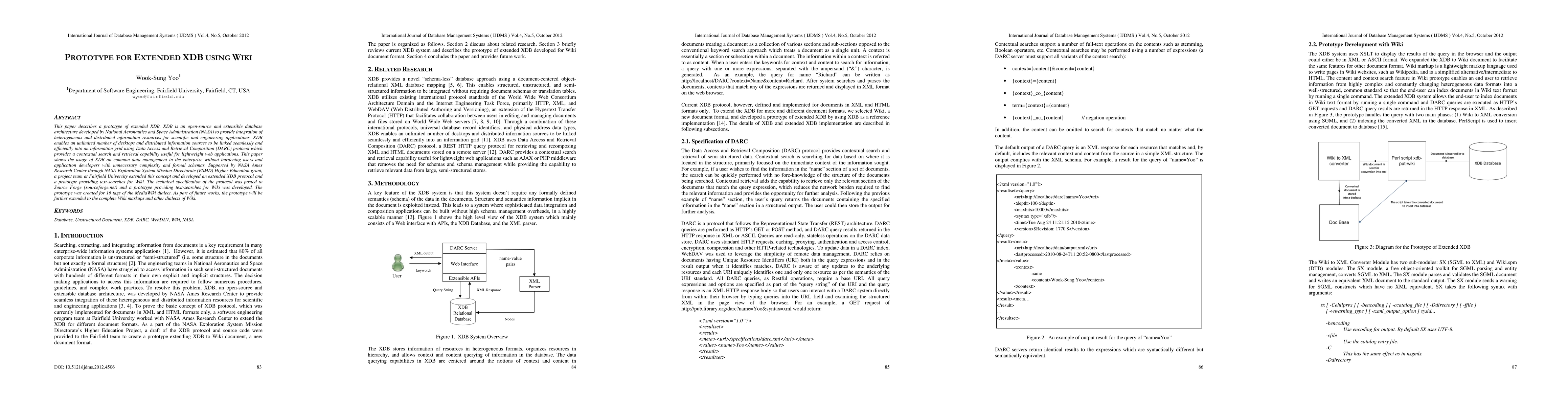 This paper describes a prototype of extended XDB. XDB is an open-source and extensible database architecture developed by National Aeronautics and Space Administration (NASA) to provide integration of heterogeneous and distributed information resources for scientific and engineering applications. XDB enables an unlimited number of desktops and distributed information sources to be linked seamlessly and efficiently into an information grid using Data Access and Retrieval Composition (DARC) protocol which provides a contextual search and retrieval capability useful for lightweight web applications. This paper shows the usage of XDB on common data management in the enterprise without burdening users and application developers with unnecessary complexity and formal schemas. Supported by NASA Ames Research Center through NASA Exploration System Mission Directorate (ESMD) Higher Education grant, a project team at Fairfield University extended this concept and developed an extended XDB protocol and a prototype providing text-searches for Wiki. The technical specification of the protocol was posted to Source Forge (sourceforge.net) and a prototype providing text-searches for Wiki was developed. The prototype was created for 16 tags of the MediaWiki dialect. As part of future works, the prototype will be further extended to the complete Wiki markups and other dialects of Wiki.