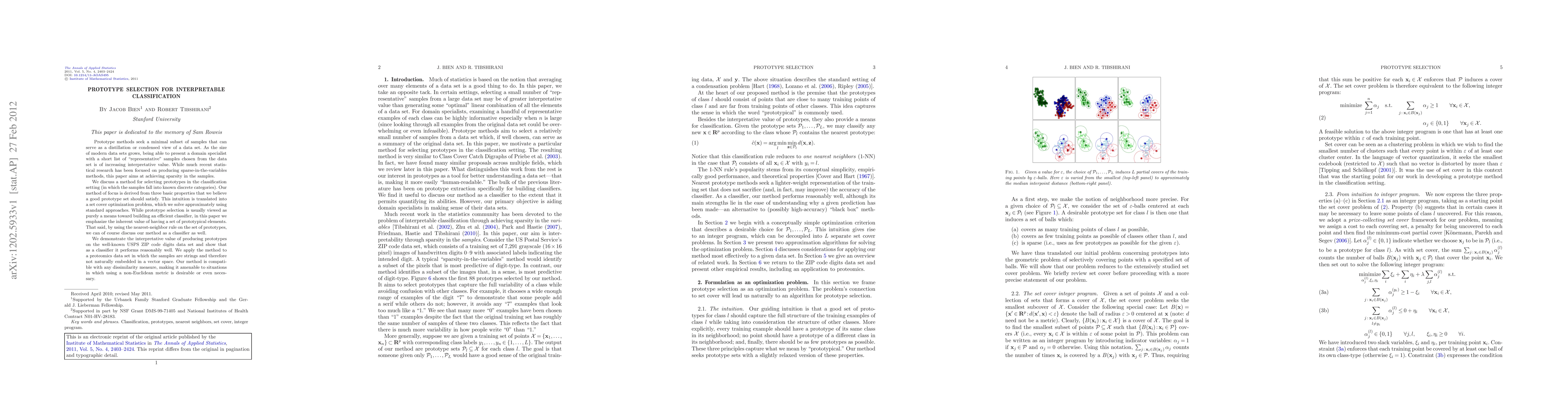 Prototype methods seek a minimal subset of samples that can serve as a distillation or condensed view of a data set. As the size of modern data sets grows, being able to present a domain specialist with a short list of "representative" samples chosen from the data set is of increasing interpretative value. While much recent statistical research has been focused on producing sparse-in-the-variables methods, this paper aims at achieving sparsity in the samples. We discuss a method for selecting prototypes in the classification setting (in which the samples fall into known discrete categories). Our method of focus is derived from three basic properties that we believe a good prototype set should satisfy. This intuition is translated into a set cover optimization problem, which we solve approximately using standard approaches. While prototype selection is usually viewed as purely a means toward building an efficient classifier, in this paper we emphasize the inherent value of having a set of prototypical elements. That said, by using the nearest-neighbor rule on the set of prototypes, we can of course discuss our method as a classifier as well.