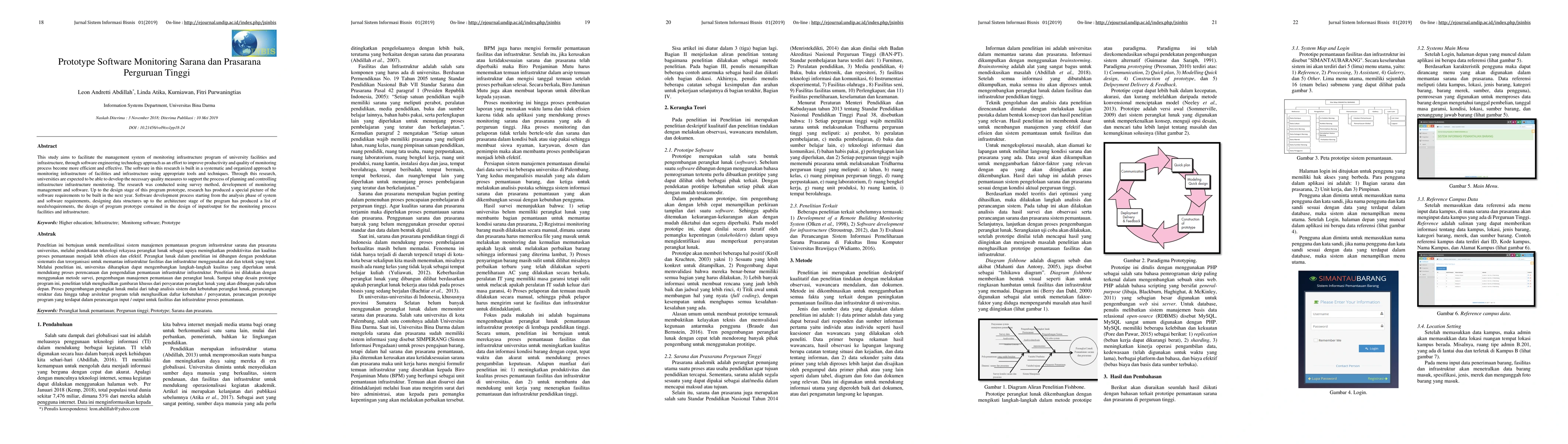 This study aims to facilitate the management system of monitoring infrastructure program of university facilities and infrastructure, through software engineering technology approach as an effort to improve productivity and quality of monitoring process become more efficient and effective. The software in this research is built in a systematic and organized approach to monitoring infrastructure of facilities and infrastructure using appropriate tools and techniques. Through this research, universities are expected to be able to develop the necessary quality measures to support the process of planning and controlling infrastructure infrastructure monitoring. The research was conducted using survey method, development of monitoring management and software. Up to the design stage of this program prototype, research has produced a special picture of the software requirements to be built in the next year. Software development process starting from the analysis phase of system and software requirements, designing data structures up to the architecture stage of the program has produced a list of needs/requirements, the design of program prototype contained in the design of input/output for the monitoring process facilities and infrastructure.