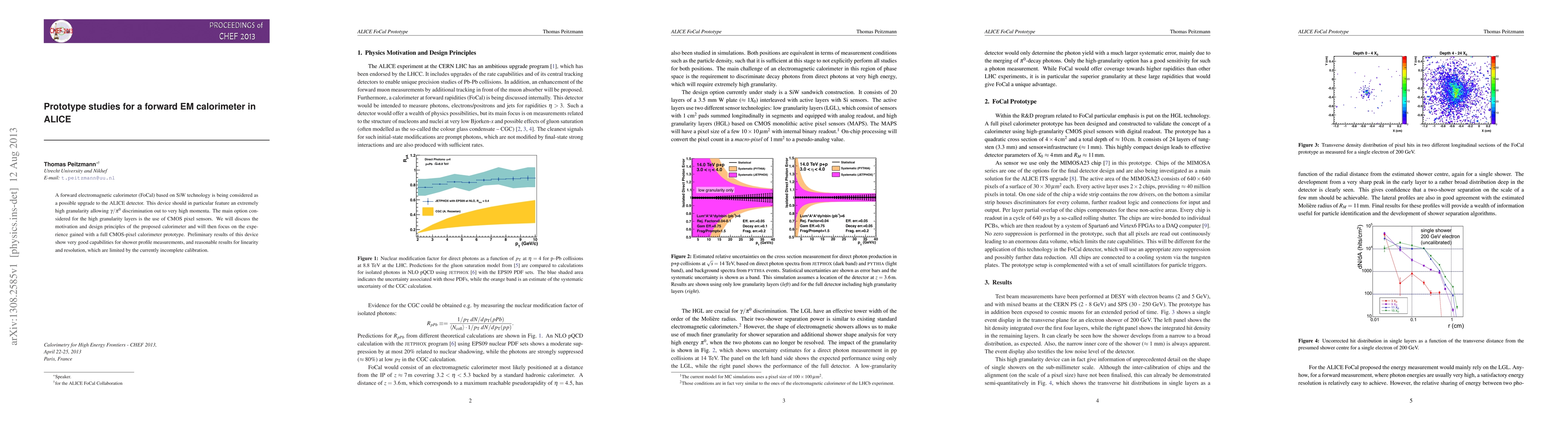 This paper discusses the design and prototype studies for a forward electromagnetic calorimeter (FoCal) using SiW technology and CMOS pixel sensors to enhance the ALICE detector's capabilities, particularly for gamma/pi0 discrimination. Preliminary results from a full CMOS-pixel prototype indicate promising performance in shower profile measurements, though calibration limitations affect linearity and resolution.