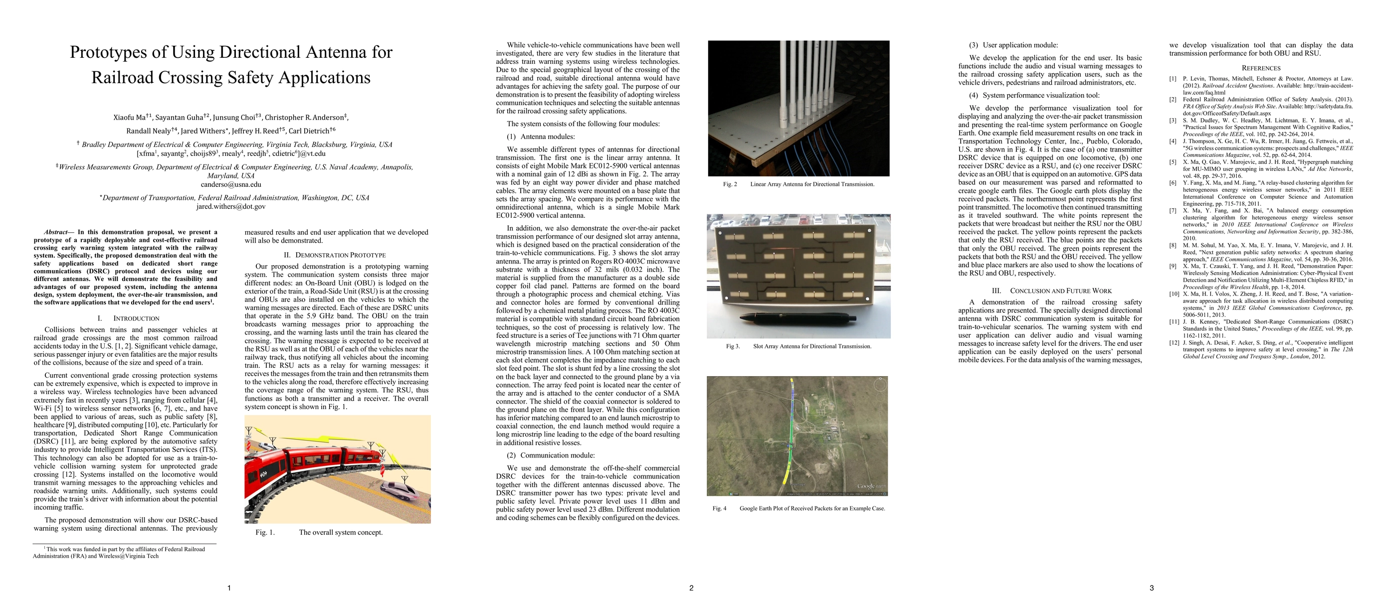 In this demonstration proposal, we present a prototype of a rapidly deployable and cost-effective railroad crossing early warning system integrated with the railway system. Specifically, the proposed demonstration deal with the safety applications based on dedicated short range communications (DSRC) protocol and devices using our different antennas. We will demonstrate the feasibility and advantages of our proposed system, including the antenna design, system deployment, the over-the-air transmission, and the software applications that we developed for the end users.