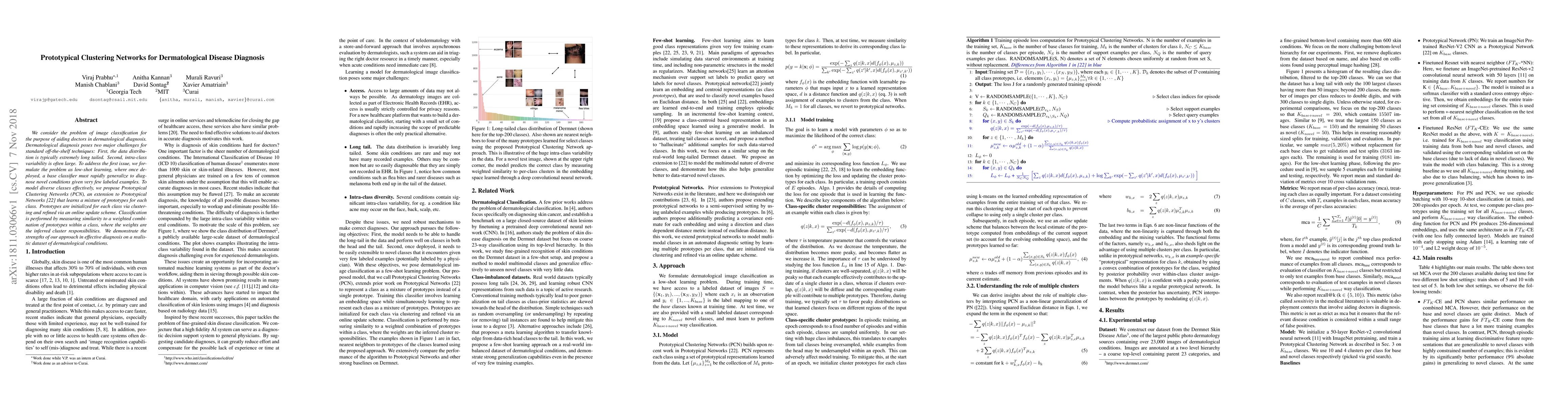 This paper proposes Prototypical Clustering Networks (PCN) to tackle the challenges of long-tailed data distribution and high intra-class variability in dermatological disease diagnosis. PCN extends Prototypical Networks by learning a mixture of prototypes per class, initialized via clustering and refined online, to improve classification accuracy.