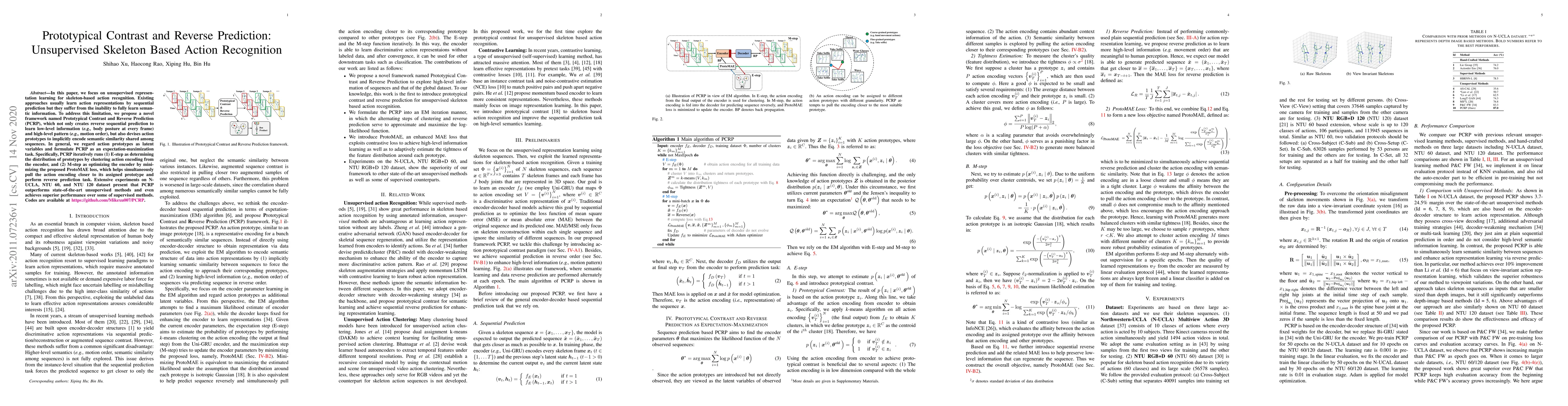 In this paper, we focus on unsupervised representation learning for skeleton-based action recognition. Existing approaches usually learn action representations by sequential prediction but they suffer from the inability to fully learn semantic information. To address this limitation, we propose a novel framework named Prototypical Contrast and Reverse Prediction (PCRP), which not only creates reverse sequential prediction to learn low-level information (e.g., body posture at every frame) and high-level pattern (e.g., motion order), but also devises action prototypes to implicitly encode semantic similarity shared among sequences. In general, we regard action prototypes as latent variables and formulate PCRP as an expectation-maximization task. Specifically, PCRP iteratively runs (1) E-step as determining the distribution of prototypes by clustering action encoding from the encoder, and (2) M-step as optimizing the encoder by minimizing the proposed ProtoMAE loss, which helps simultaneously pull the action encoding closer to its assigned prototype and perform reverse prediction task. Extensive experiments on N-UCLA, NTU 60, and NTU 120 dataset present that PCRP outperforms state-of-the-art unsupervised methods and even achieves superior performance over some of supervised methods. Codes are available at https://github.com/Mikexu007/PCRP.