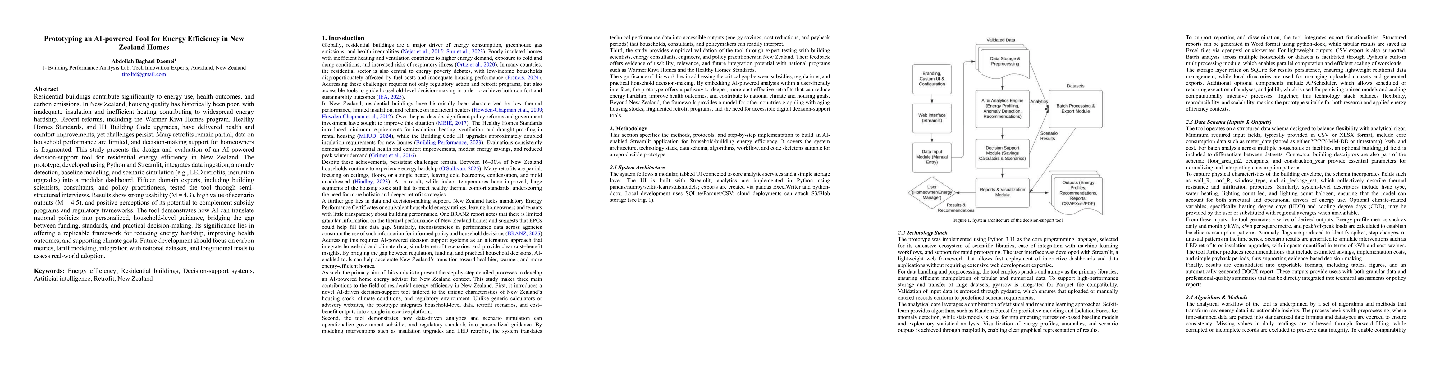 Residential buildings contribute significantly to energy use, health outcomes, and carbon emissions. In New Zealand, housing quality has historically been poor, with inadequate insulation and inefficient heating contributing to widespread energy hardship. Recent reforms, including the Warmer Kiwi Homes program, Healthy Homes Standards, and H1 Building Code upgrades, have delivered health and comfort improvements, yet challenges persist. Many retrofits remain partial, data on household performance are limited, and decision-making support for homeowners is fragmented. This study presents the design and evaluation of an AI-powered decision-support tool for residential energy efficiency in New Zealand. The prototype, developed using Python and Streamlit, integrates data ingestion, anomaly detection, baseline modeling, and scenario simulation (e.g., LED retrofits, insulation upgrades) into a modular dashboard. Fifteen domain experts, including building scientists, consultants, and policy practitioners, tested the tool through semi-structured interviews. Results show strong usability (M = 4.3), high value of scenario outputs (M = 4.5), and positive perceptions of its potential to complement subsidy programs and regulatory frameworks. The tool demonstrates how AI can translate national policies into personalized, household-level guidance, bridging the gap between funding, standards, and practical decision-making. Its significance lies in offering a replicable framework for reducing energy hardship, improving health outcomes, and supporting climate goals. Future development should focus on carbon metrics, tariff modeling, integration with national datasets, and longitudinal trials to assess real-world adoption.