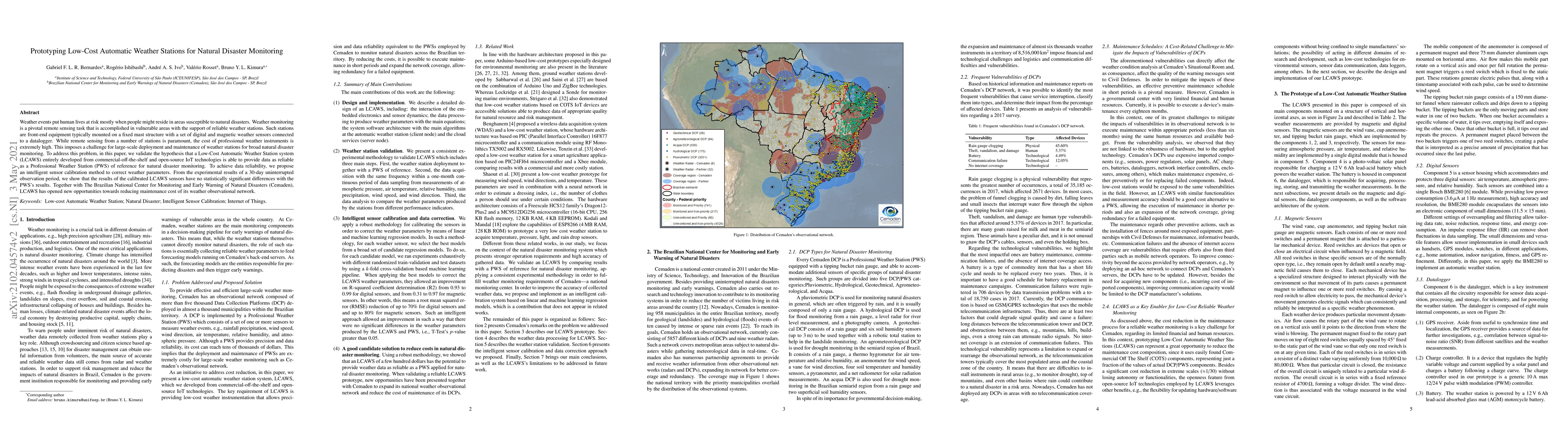 Weather events put human lives at risk mostly when people might reside in areas susceptible to natural disasters. Weather monitoring is a pivotal task that is accomplished in vulnerable areas with the support of reliable weather stations. Such stations are front-end equipment typically mounted on a fixed mast structure with a set of digital and magnetic weather sensors connected to a datalogger. While remote sensing from a number of stations is paramount, the cost of professional weather instruments is extremely high. This imposes a challenge for large-scale deployment and maintenance of weather stations for broad natural disaster monitoring. To address this problem, in this paper, we validate the hypothesis that a Low-Cost Automatic Weather Station system (LCAWS) entirely developed from commercial-off-the-shelf and open-source IoT technologies is able to provide data as reliable as a Professional Weather Station (PWS) of reference for natural disaster monitoring. To achieve data reliability, we propose an intelligent sensor calibration method to correct weather parameters. From the experimental results of a 30-day uninterrupted observation period, we show that the results of the calibrated LCAWS sensors have no statistically significant differences with the PWS's results. Together with The Brazilian National Center for Monitoring and Early Warning of Natural Disasters (Cemaden), LCAWS has opened new opportunities towards reducing maintenance cost of its weather observational network.