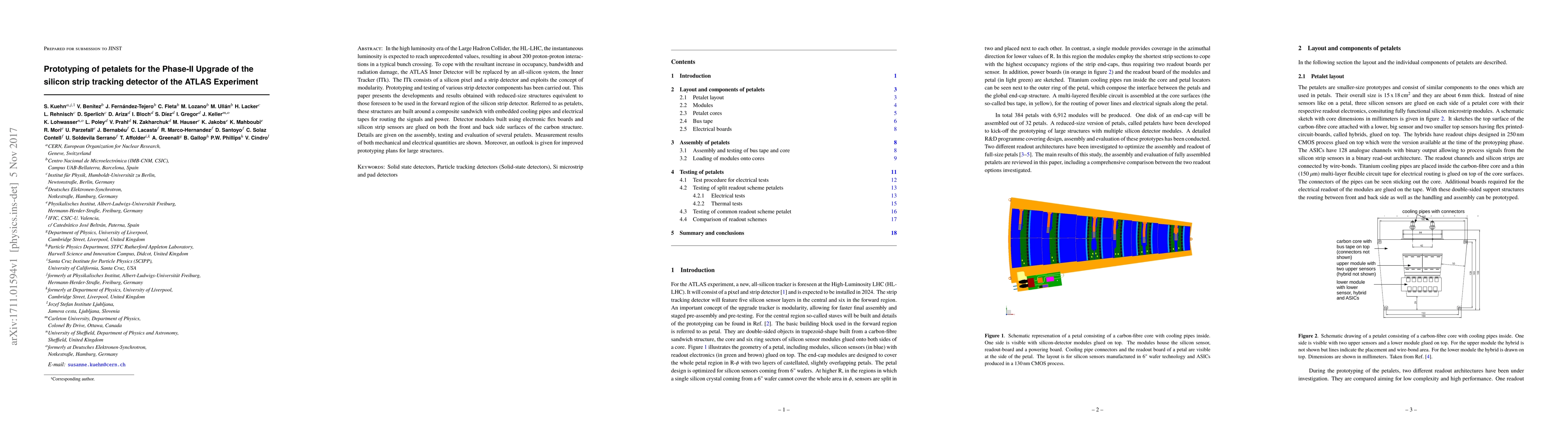 In the high luminosity era of the Large Hadron Collider, the HL-LHC, the instantaneous luminosity is expected to reach unprecedented values, resulting in about 200 proton-proton interactions in a typical bunch crossing. To cope with the resultant increase in occupancy, bandwidth and radiation damage, the ATLAS Inner Detector will be replaced by an all-silicon system, the Inner Tracker (ITk). The ITk consists of a silicon pixel and a strip detector and exploits the concept of modularity. Prototyping and testing of various strip detector components has been carried out. This paper presents the developments and results obtained with reduced-size structures equivalent to those foreseen to be used in the forward region of the silicon strip detector. Referred to as petalets, these structures are built around a composite sandwich with embedded cooling pipes and electrical tapes for routing the signals and power. Detector modules built using electronic flex boards and silicon strip sensors are glued on both the front and back side surfaces of the carbon structure. Details are given on the assembly, testing and evaluation of several petalets. Measurement results of both mechanical and electrical quantities are shown. Moreover, an outlook is given for improved prototyping plans for large structures.