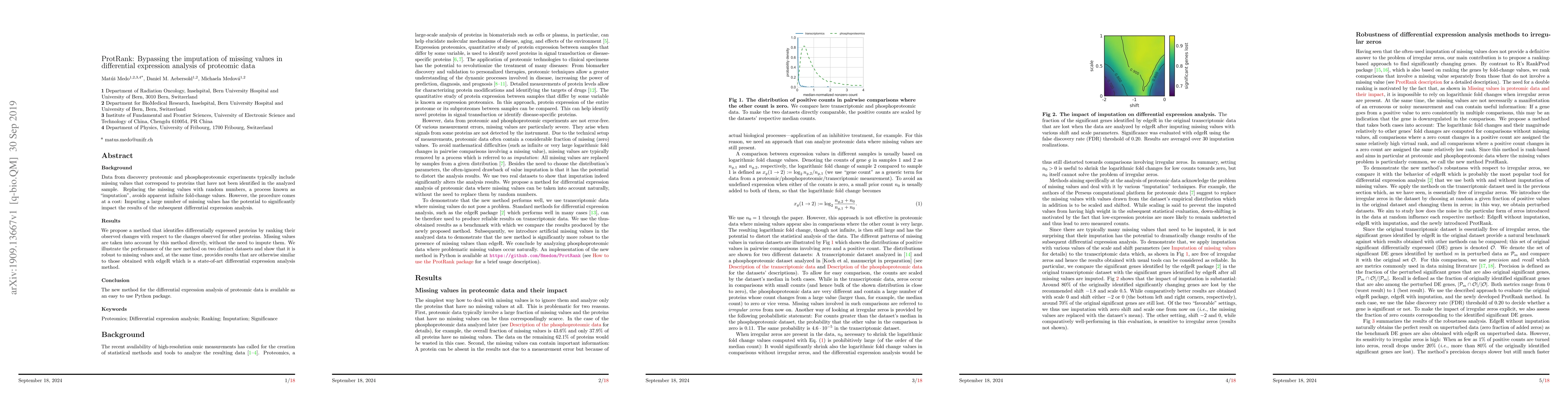 ProtRank proposes a novel method to identify differentially expressed proteins without imputing missing values, directly ranking observed changes and demonstrating robustness and comparable results to edgeR on proteomic datasets. The method is implemented in a user-friendly Python package.