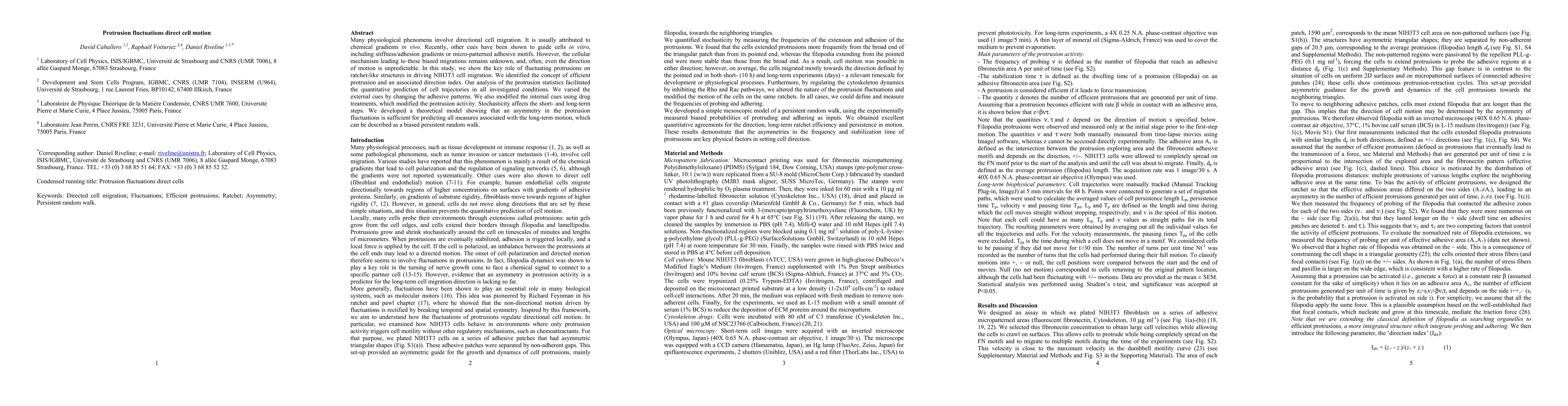 Many physiological phenomena involve directional cell migration. It is usually attributed to chemical gradients in vivo. Recently, other cues have been shown to guide cells in vitro, including stiffness/adhesion gradients or micro-patterned adhesive motifs. However, the cellular mechanism leading to these biased migrations remains unknown, and, often, even the direction of motion is unpredictable. In this study, we show the key role of fluctuating protrusions on ratchet-like structures in driving NIH3T3 cell migration. We identified the concept of efficient protrusion and an associated direction index. Our analysis of the protrusion statistics facilitated the quantitative prediction of cell trajectories in all investigated conditions. We varied the external cues by changing the adhesive patterns. We also modified the internal cues using drug treatments, which modified the protrusion activity. Stochasticity affects the short- and long-term steps. We developed a theoretical model showing that an asymmetry in the protrusion fluctuations is sufficient for predicting all measures associated with the long-term motion, which can be described as a biased persistent random walk.