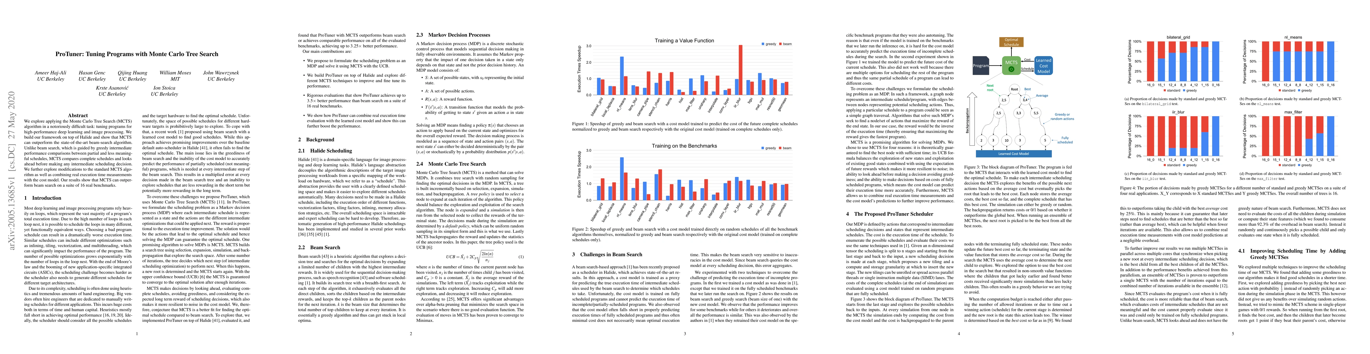 We explore applying the Monte Carlo Tree Search (MCTS) algorithm in a notoriously difficult task: tuning programs for high-performance deep learning and image processing. We build our framework on top of Halide and show that MCTS can outperform the state-of-the-art beam-search algorithm. Unlike beam search, which is guided by greedy intermediate performance comparisons between partial and less meaningful schedules, MCTS compares complete schedules and looks ahead before making any intermediate scheduling decision. We further explore modifications to the standard MCTS algorithm as well as combining real execution time measurements with the cost model. Our results show that MCTS can outperform beam search on a suite of 16 real benchmarks.