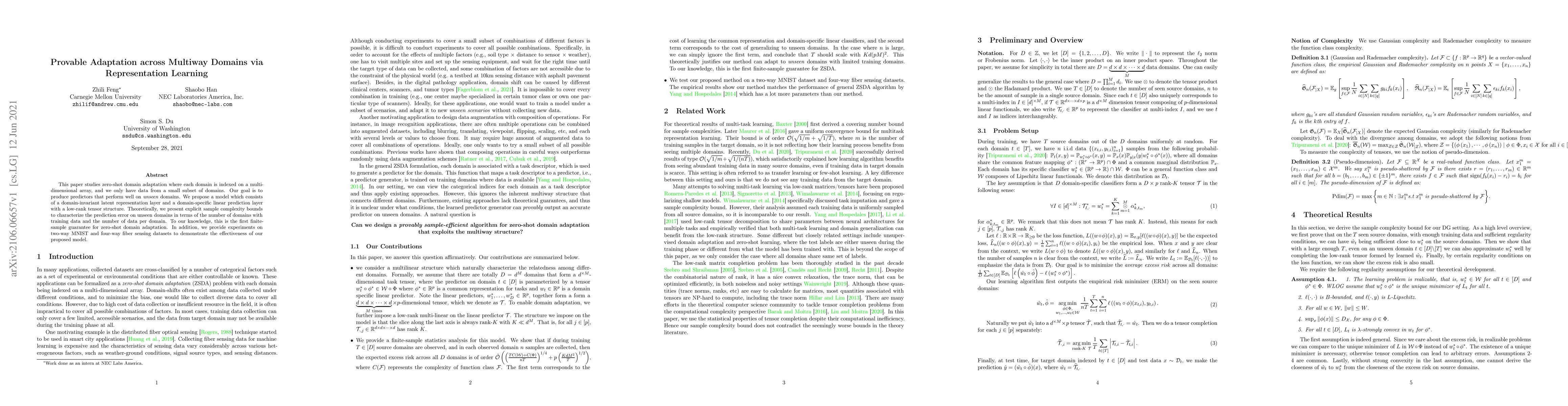 This paper studies zero-shot domain adaptation where each domain is indexed on a multi-dimensional array, and we only have data from a small subset of domains. Our goal is to produce predictors that perform well on \emph{unseen} domains. We propose a model which consists of a domain-invariant latent representation layer and a domain-specific linear prediction layer with a low-rank tensor structure. Theoretically, we present explicit sample complexity bounds to characterize the prediction error on unseen domains in terms of the number of domains with training data and the number of data per domain. To our knowledge, this is the first finite-sample guarantee for zero-shot domain adaptation. In addition, we provide experiments on two-way MNIST and four-way fiber sensing datasets to demonstrate the effectiveness of our proposed model.