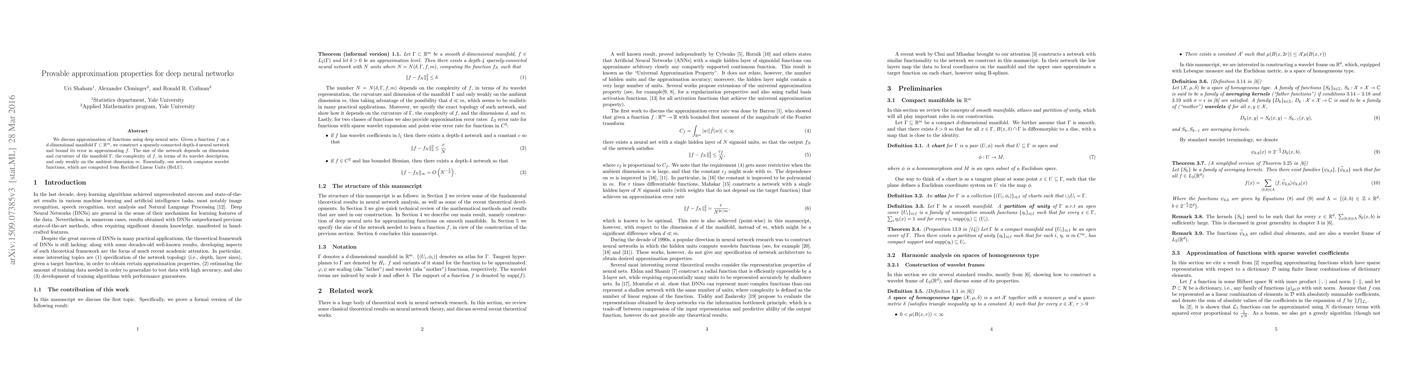 We discuss approximation of functions using deep neural nets. Given a function $f$ on a $d$-dimensional manifold $\Gamma \subset \mathbb{R}^m$, we construct a sparsely-connected depth-4 neural network and bound its error in approximating $f$. The size of the network depends on dimension and curvature of the manifold $\Gamma$, the complexity of $f$, in terms of its wavelet description, and only weakly on the ambient dimension $m$. Essentially, our network computes wavelet functions, which are computed from Rectified Linear Units (ReLU)
