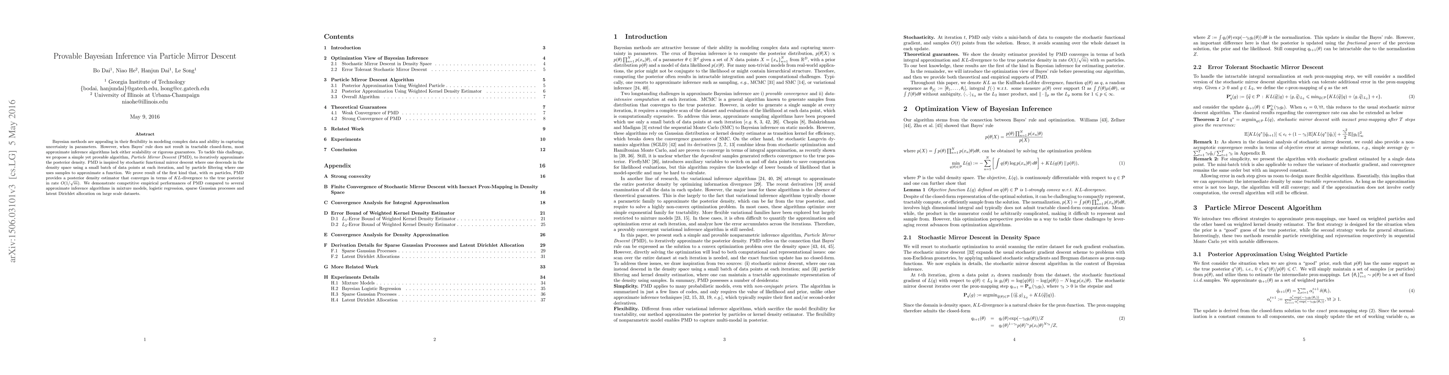 This paper proposes Particle Mirror Descent (PMD), a scalable and provable algorithm for Bayesian inference when closed-form solutions are intractable. PMD combines stochastic functional mirror descent and particle filtering, offering a convergence rate of $O(1/\sqrt{m})$ in $KL$-divergence and competitive performance on large datasets.