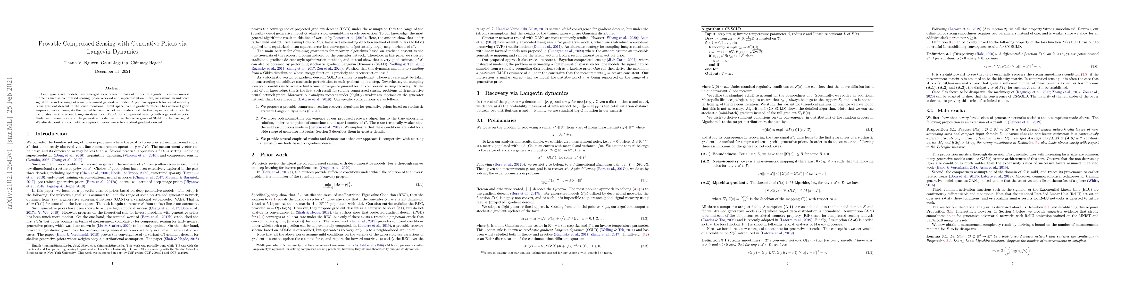 This paper proposes using stochastic gradient Langevin dynamics (SGLD) for compressed sensing with generative priors, proving its convergence to the true signal under mild assumptions. It also shows that SGLD performs competitively with standard gradient descent in empirical tests.