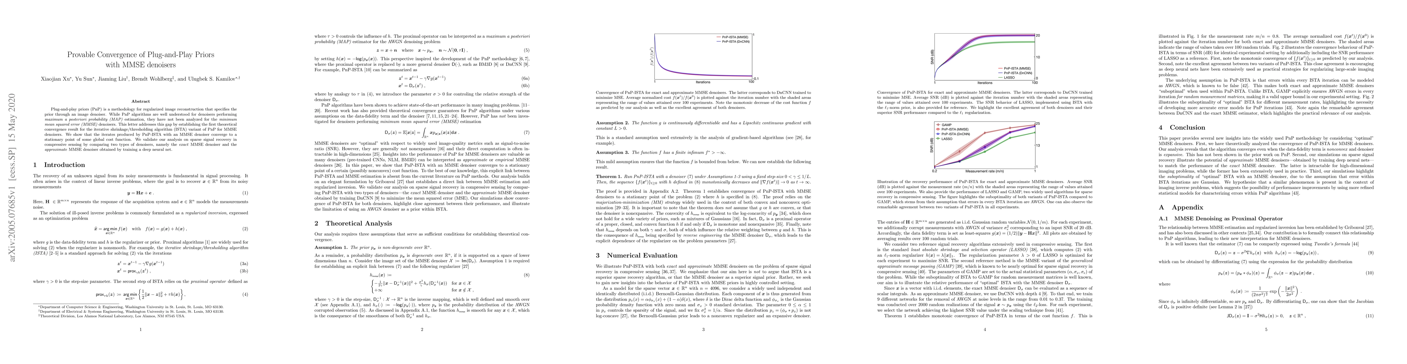 This paper establishes the first theoretical convergence result for Plug-and-Play Priors (PnP) algorithms using Minimum Mean Squared Error (MMSE) denoisers, proving that PnP-ISTA with MMSE denoisers converges to a stationary point of a global cost function. The analysis is validated through sparse signal recovery in compressive sensing using both exact and approximate MMSE denoisers.