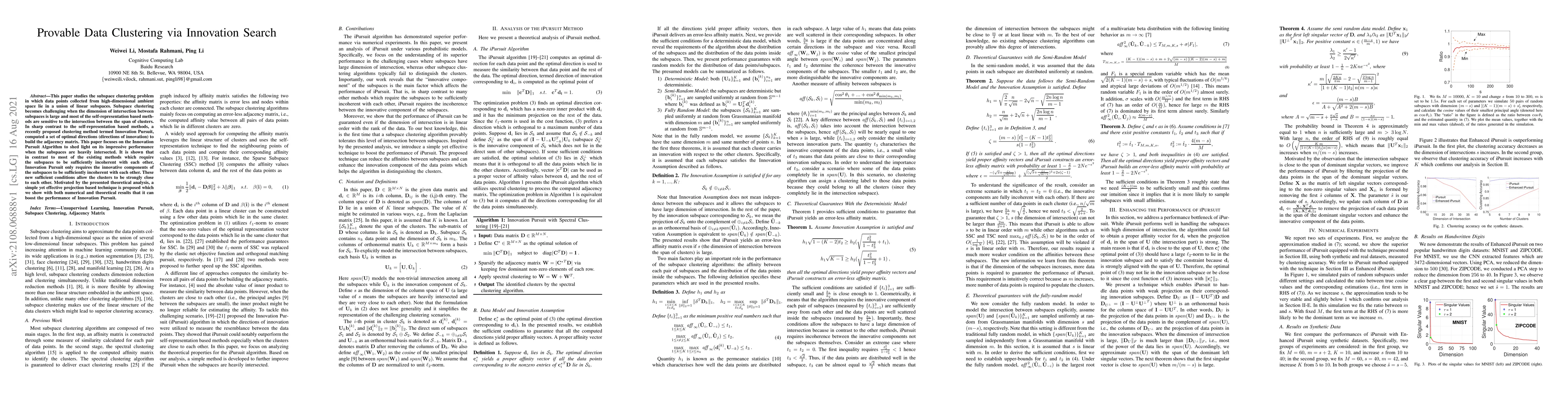 This paper explores the Innovation Pursuit Algorithm for subspace clustering in high-dimensional data, demonstrating its effectiveness even when subspaces intersect significantly. Unlike self-representation methods, Innovation Pursuit requires only the innovative components to be incoherent, leading to improved performance and a proposed projection technique to further enhance its results.