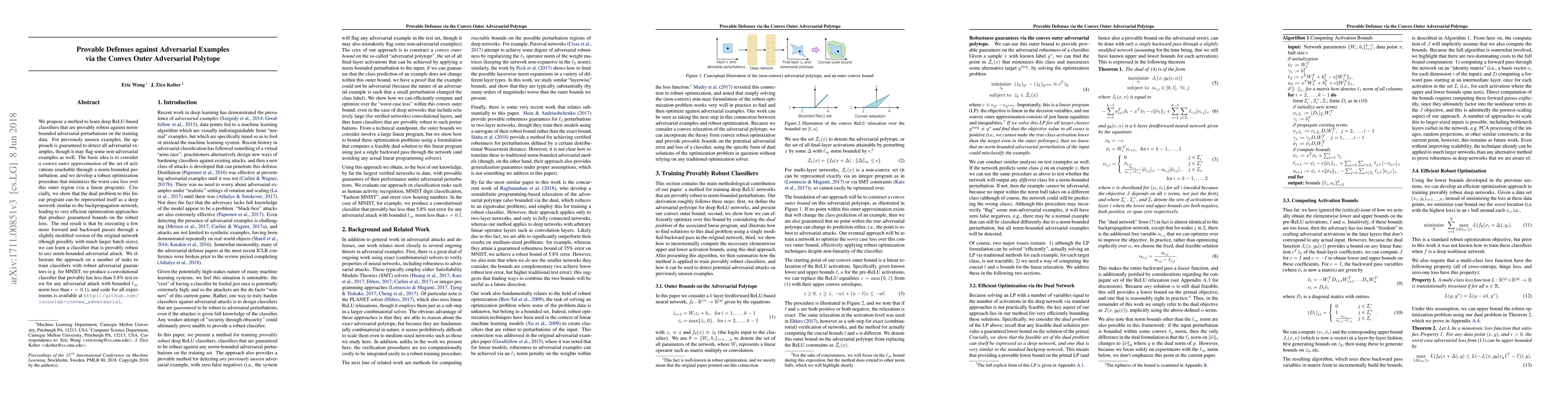 We propose a method to learn deep ReLU-based classifiers that are provably robust against norm-bounded adversarial perturbations on the training data. For previously unseen examples, the approach is guaranteed to detect all adversarial examples, though it may flag some non-adversarial examples as well. The basic idea is to consider a convex outer approximation of the set of activations reachable through a norm-bounded perturbation, and we develop a robust optimization procedure that minimizes the worst case loss over this outer region (via a linear program). Crucially, we show that the dual problem to this linear program can be represented itself as a deep network similar to the backpropagation network, leading to very efficient optimization approaches that produce guaranteed bounds on the robust loss. The end result is that by executing a few more forward and backward passes through a slightly modified version of the original network (though possibly with much larger batch sizes), we can learn a classifier that is provably robust to any norm-bounded adversarial attack. We illustrate the approach on a number of tasks to train classifiers with robust adversarial guarantees (e.g. for MNIST, we produce a convolutional classifier that provably has less than 5.8% test error for any adversarial attack with bounded $\ell_\infty$ norm less than $\epsilon = 0.1$), and code for all experiments in the paper is available at https://github.com/locuslab/convex_adversarial.