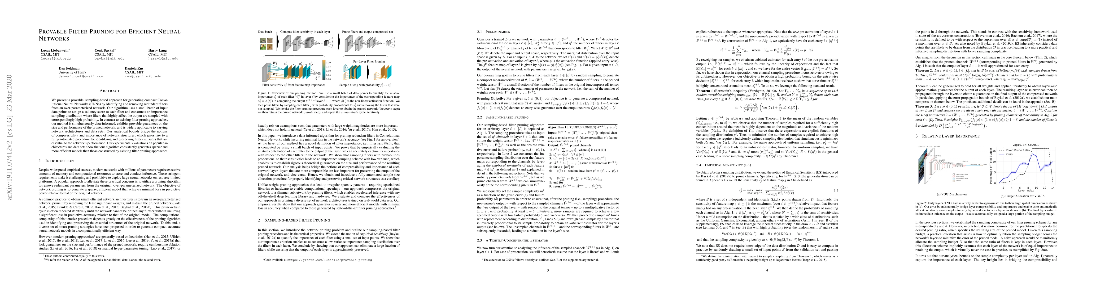This paper introduces a provable, sampling-based method for efficiently pruning Convolutional Neural Networks by removing redundant filters, ensuring performance and size guarantees. The approach uses input data to assign saliency scores, enabling the generation of compact, efficient networks that outperform existing methods.