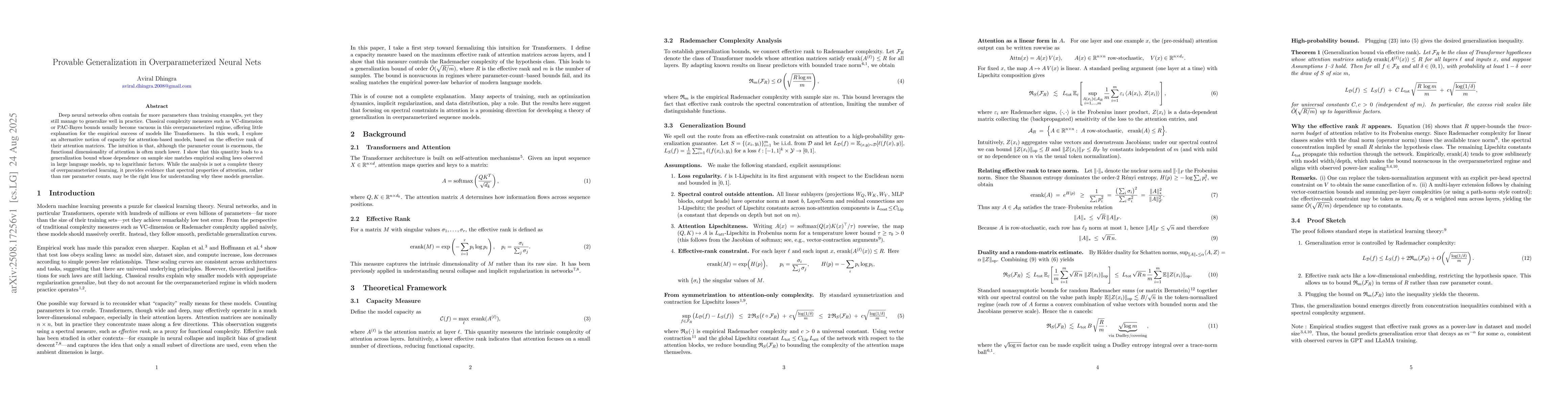 Deep neural networks often contain far more parameters than training examples, yet they still manage to generalize well in practice. Classical complexity measures such as VC-dimension or PAC-Bayes bounds usually become vacuous in this overparameterized regime, offering little explanation for the empirical success of models like Transformers. In this work, I explore an alternative notion of capacity for attention-based models, based on the effective rank of their attention matrices. The intuition is that, although the parameter count is enormous, the functional dimensionality of attention is often much lower. I show that this quantity leads to a generalization bound whose dependence on sample size matches empirical scaling laws observed in large language models, up to logarithmic factors. While the analysis is not a complete theory of overparameterized learning, it provides evidence that spectral properties of attention, rather than raw parameter counts, may be the right lens for understanding why these models generalize.