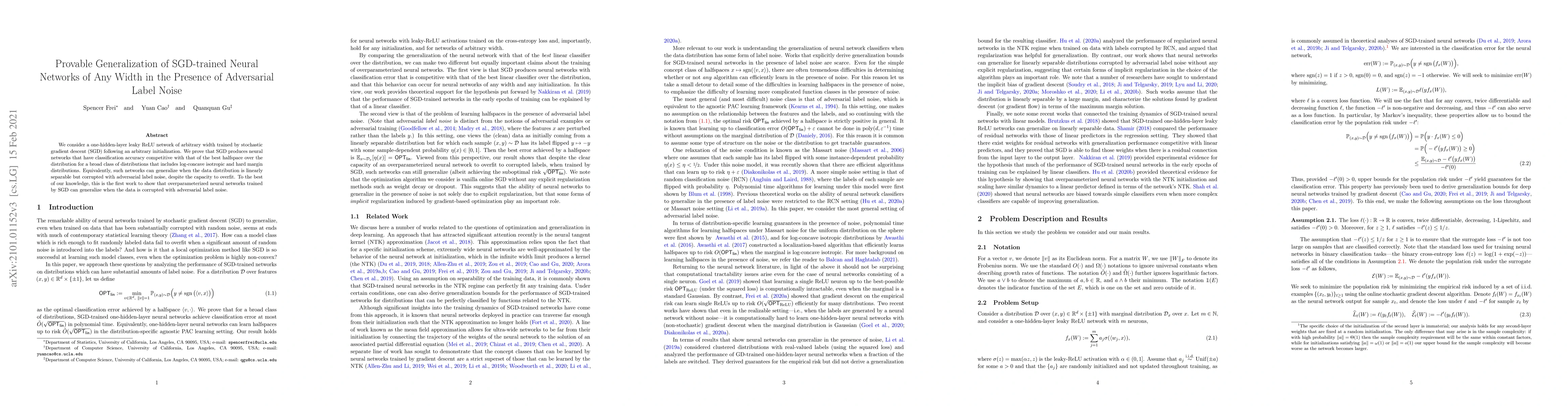 This paper proves that stochastic gradient descent (SGD) can train overparameterized neural networks to achieve classification accuracy comparable to the best halfspaces, even when the data is corrupted with adversarial label noise. This result demonstrates the generalization capability of such networks under challenging conditions.