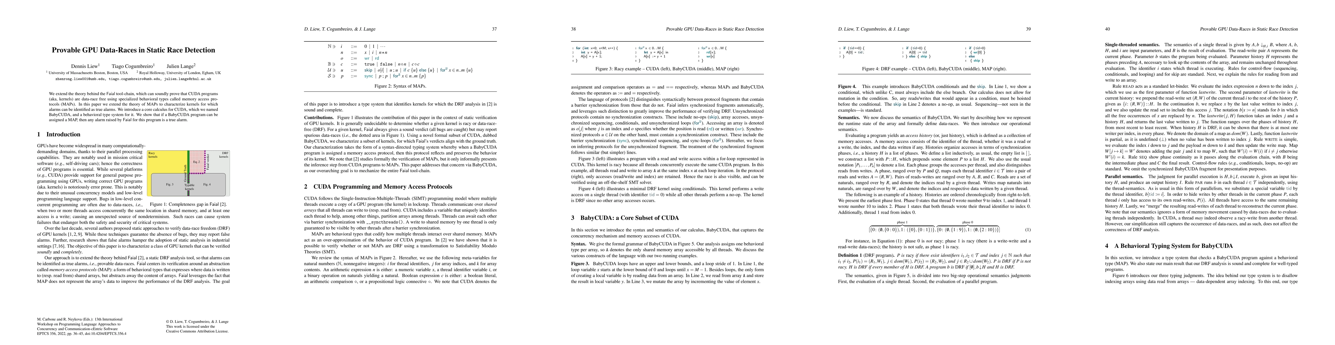 We extend the theory behind the Faial tool-chain, which can soundly prove that CUDA programs (aka, kernels) are data-race free using specialized behavioral types called memory access protocols (MAPs). In this paper we extend the theory of MAPs to characterize kernels for which alarms can be identified as true alarms. We introduce a core calculus for CUDA, which we named BabyCUDA, and a behavioral type system for it. We show that if a BabyCUDA program can be assigned a MAP, then any alarm raised by Faial for this program is a true alarm.