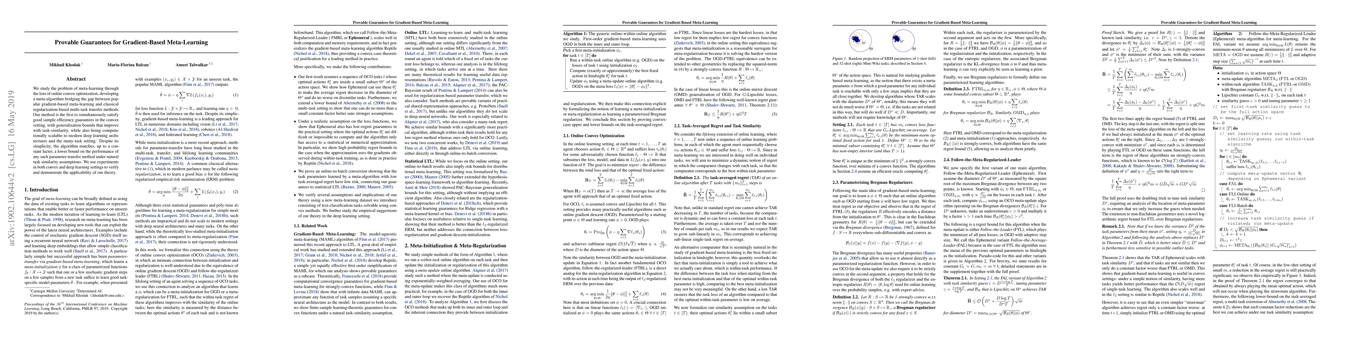 We study the problem of meta-learning through the lens of online convex optimization, developing a meta-algorithm bridging the gap between popular gradient-based meta-learning and classical regularization-based multi-task transfer methods. Our method is the first to simultaneously satisfy good sample efficiency guarantees in the convex setting, with generalization bounds that improve with task-similarity, while also being computationally scalable to modern deep learning architectures and the many-task setting. Despite its simplicity, the algorithm matches, up to a constant factor, a lower bound on the performance of any such parameter-transfer method under natural task similarity assumptions. We use experiments in both convex and deep learning settings to verify and demonstrate the applicability of our theory.