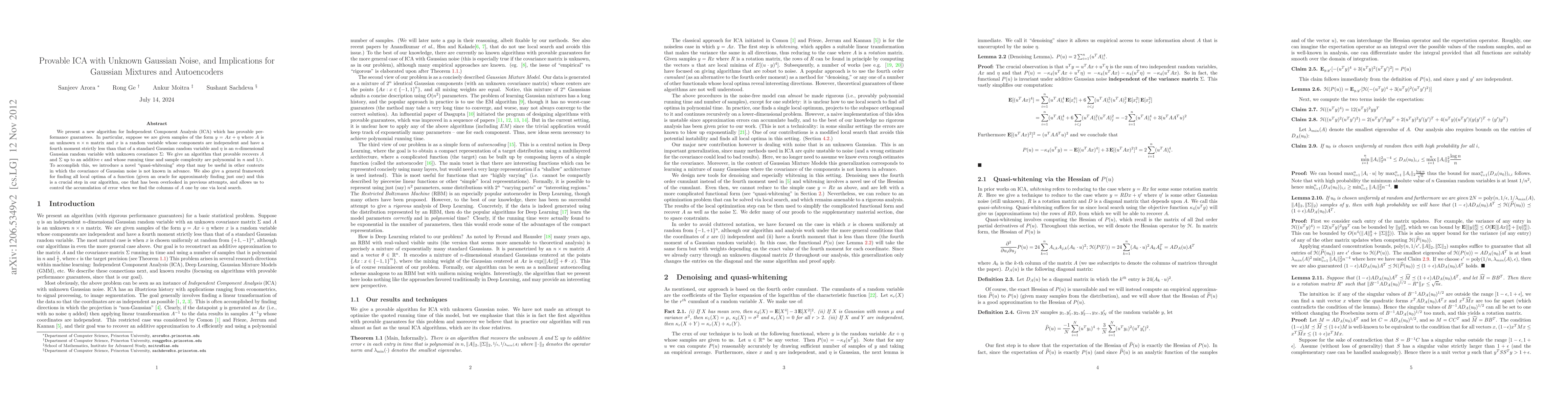 We present a new algorithm for Independent Component Analysis (ICA) which has provable performance guarantees. In particular, suppose we are given samples of the form $y = Ax + \eta$ where $A$ is an unknown $n \times n$ matrix and $x$ is a random variable whose components are independent and have a fourth moment strictly less than that of a standard Gaussian random variable and $\eta$ is an $n$-dimensional Gaussian random variable with unknown covariance $\Sigma$: We give an algorithm that provable recovers $A$ and $\Sigma$ up to an additive $\epsilon$ and whose running time and sample complexity are polynomial in $n$ and $1 / \epsilon$. To accomplish this, we introduce a novel "quasi-whitening" step that may be useful in other contexts in which the covariance of Gaussian noise is not known in advance. We also give a general framework for finding all local optima of a function (given an oracle for approximately finding just one) and this is a crucial step in our algorithm, one that has been overlooked in previous attempts, and allows us to control the accumulation of error when we find the columns of $A$ one by one via local search.