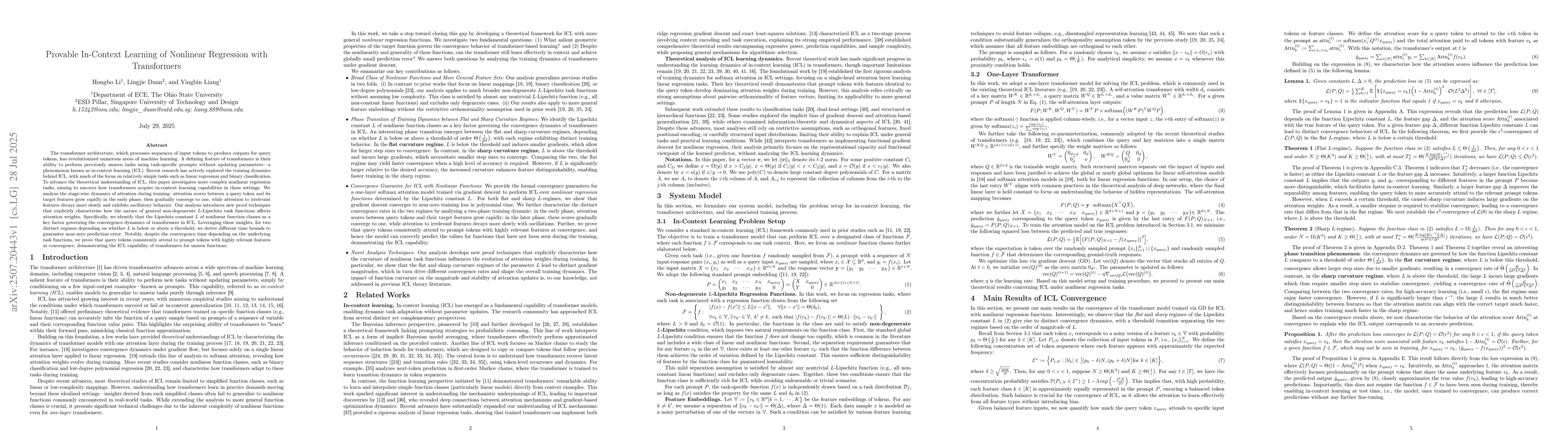The transformer architecture, which processes sequences of input tokens to produce outputs for query tokens, has revolutionized numerous areas of machine learning. A defining feature of transformers is their ability to perform previously unseen tasks using task-specific prompts without updating parameters, a phenomenon known as in-context learning (ICL). Recent research has actively explored the training dynamics behind ICL, with much of the focus on relatively simple tasks such as linear regression and binary classification. To advance the theoretical understanding of ICL, this paper investigates more complex nonlinear regression tasks, aiming to uncover how transformers acquire in-context learning capabilities in these settings. We analyze the stage-wise dynamics of attention during training: attention scores between a query token and its target features grow rapidly in the early phase, then gradually converge to one, while attention to irrelevant features decays more slowly and exhibits oscillatory behavior. Our analysis introduces new proof techniques that explicitly characterize how the nature of general non-degenerate L-Lipschitz task functions affects attention weights. Specifically, we identify that the Lipschitz constant L of nonlinear function classes as a key factor governing the convergence dynamics of transformers in ICL. Leveraging these insights, for two distinct regimes depending on whether L is below or above a threshold, we derive different time bounds to guarantee near-zero prediction error. Notably, despite the convergence time depending on the underlying task functions, we prove that query tokens consistently attend to prompt tokens with highly relevant features at convergence, demonstrating the ICL capability of transformers for unseen functions.