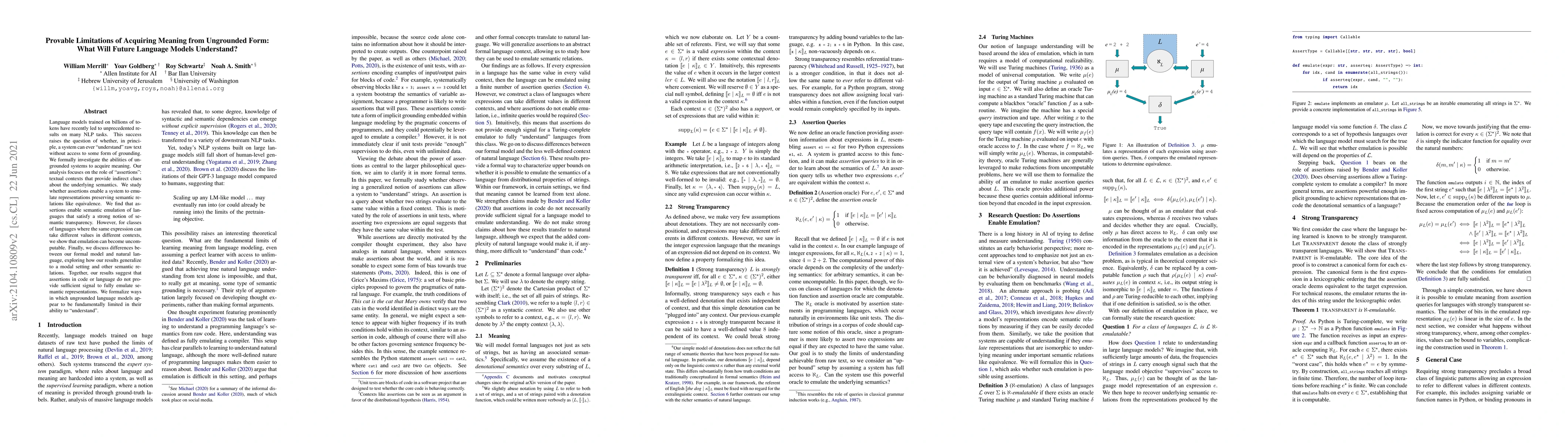 Language models trained on billions of tokens have recently led to unprecedented results on many NLP tasks. This success raises the question of whether, in principle, a system can ever ``understand'' raw text without access to some form of grounding. We formally investigate the abilities of ungrounded systems to acquire meaning. Our analysis focuses on the role of ``assertions'': textual contexts that provide indirect clues about the underlying semantics. We study whether assertions enable a system to emulate representations preserving semantic relations like equivalence. We find that assertions enable semantic emulation of languages that satisfy a strong notion of semantic transparency. However, for classes of languages where the same expression can take different values in different contexts, we show that emulation can become uncomputable. Finally, we discuss differences between our formal model and natural language, exploring how our results generalize to a modal setting and other semantic relations. Together, our results suggest that assertions in code or language do not provide sufficient signal to fully emulate semantic representations. We formalize ways in which ungrounded language models appear to be fundamentally limited in their ability to ``understand''.