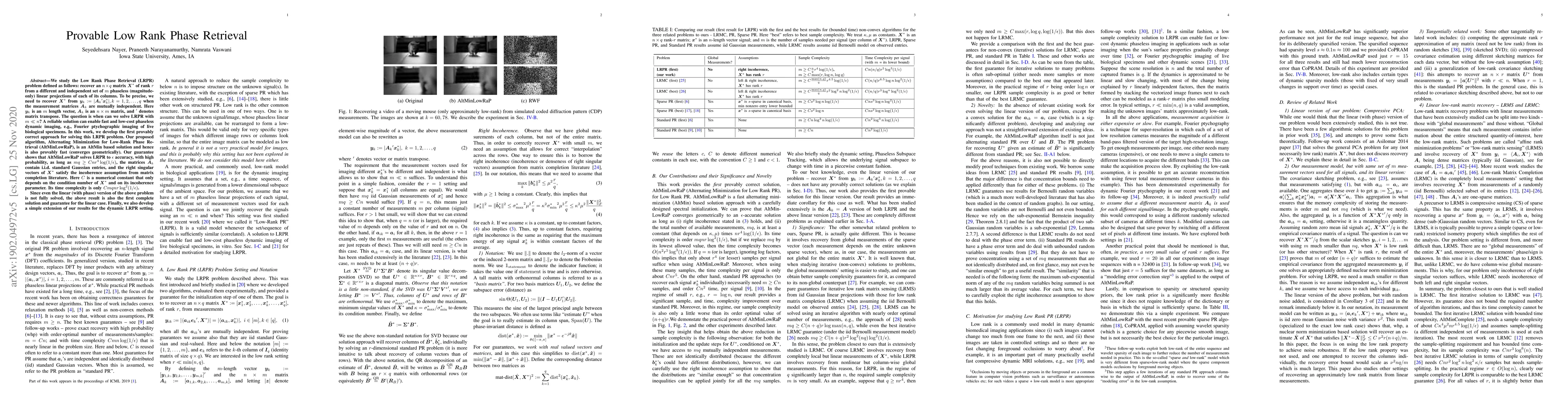We study the Low Rank Phase Retrieval (LRPR) problem defined as follows: recover an $n \times q$ matrix $X^*$ of rank $r$ from a different and independent set of $m$ phaseless (magnitude-only) linear projections of each of its columns. To be precise, we need to recover $X^*$ from $y_k := |A_k{}' x^*_k|, k=1,2,\dots, q$ when the measurement matrices $A_k$ are mutually independent. Here $y_k$ is an $m$ length vector, $A_k$ is an $n \times m$ matrix, and $'$ denotes matrix transpose. The question is when can we solve LRPR with $m \ll n$? A reliable solution can enable fast and low-cost phaseless dynamic imaging, e.g., Fourier ptychographic imaging of live biological specimens. In this work, we develop the first provably correct approach for solving this LRPR problem. Our proposed algorithm, Alternating Minimization for Low-Rank Phase Retrieval (AltMinLowRaP), is an AltMin based solution and hence is also provably fast (converges geometrically). Our guarantee shows that AltMinLowRaP solves LRPR to $\epsilon$ accuracy, with high probability, as long as $m q \ge C n r^4 \log(1/\epsilon)$, the matrices $A_k$ contain i.i.d. standard Gaussian entries, and the right singular vectors of $X^*$ satisfy the incoherence assumption from matrix completion literature. Here $C$ is a numerical constant that only depends on the condition number of $X^*$ and on its incoherence parameter. Its time complexity is only $ C mq nr \log^2(1/\epsilon)$. Since even the linear (with phase) version of the above problem is not fully solved, the above result is also the first complete solution and guarantee for the linear case. Finally, we also develop a simple extension of our results for the dynamic LRPR setting.